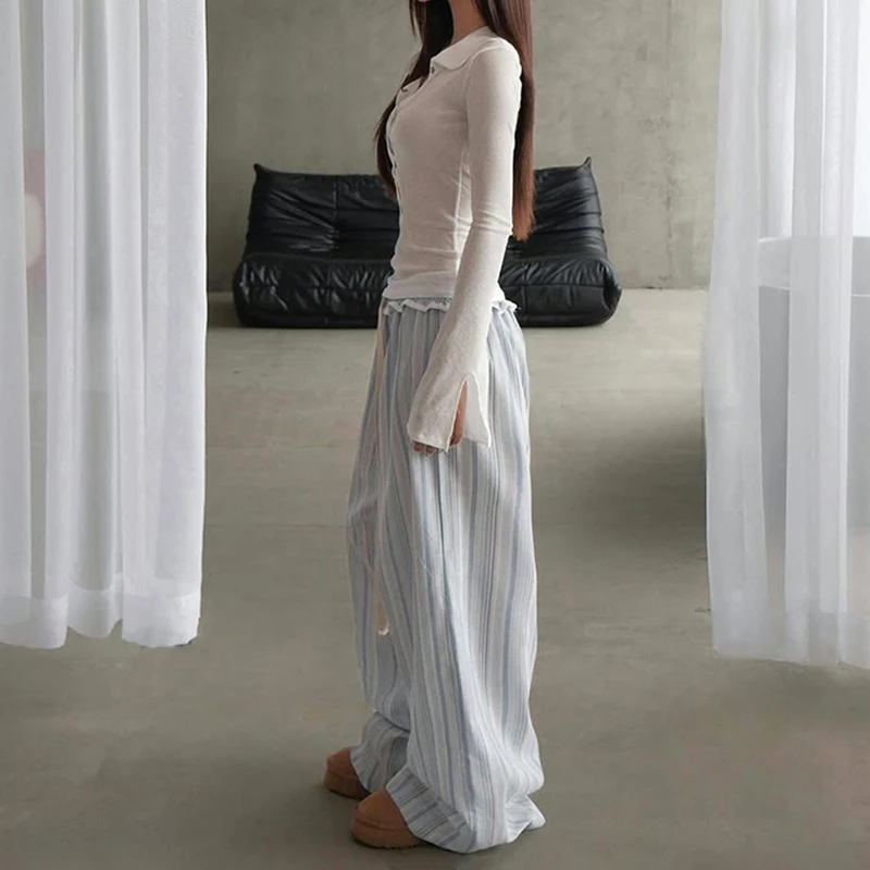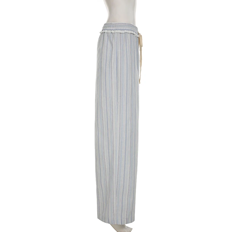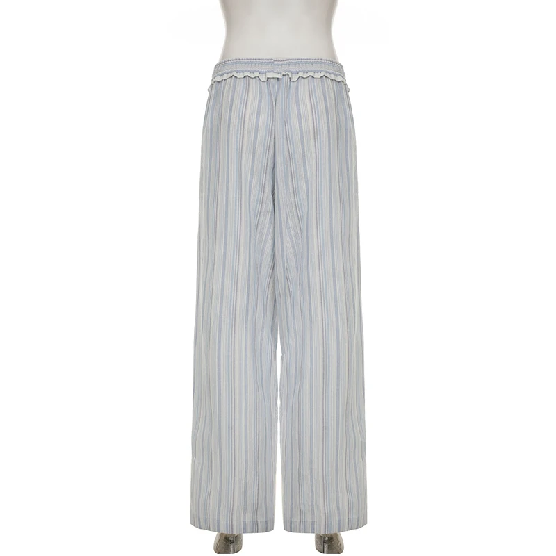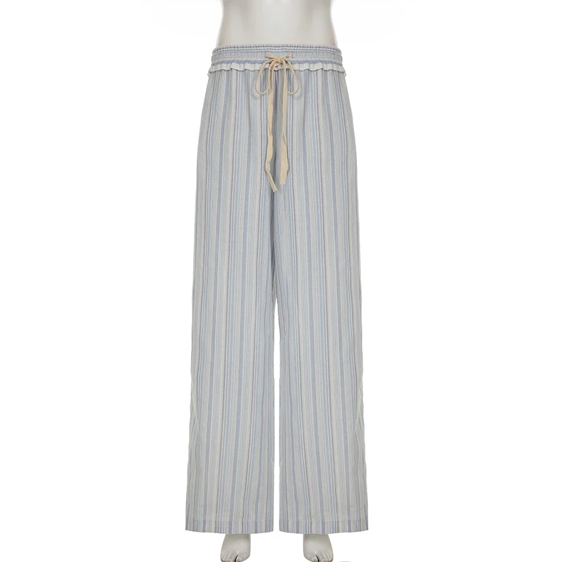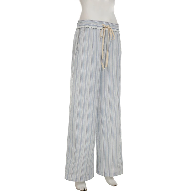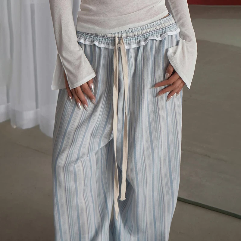 fashion Stringy Selvedge Stripe Casual Pants Drawstring Basic All-match Vintage Blue Chic Trousers Vacation Loose Bottoms