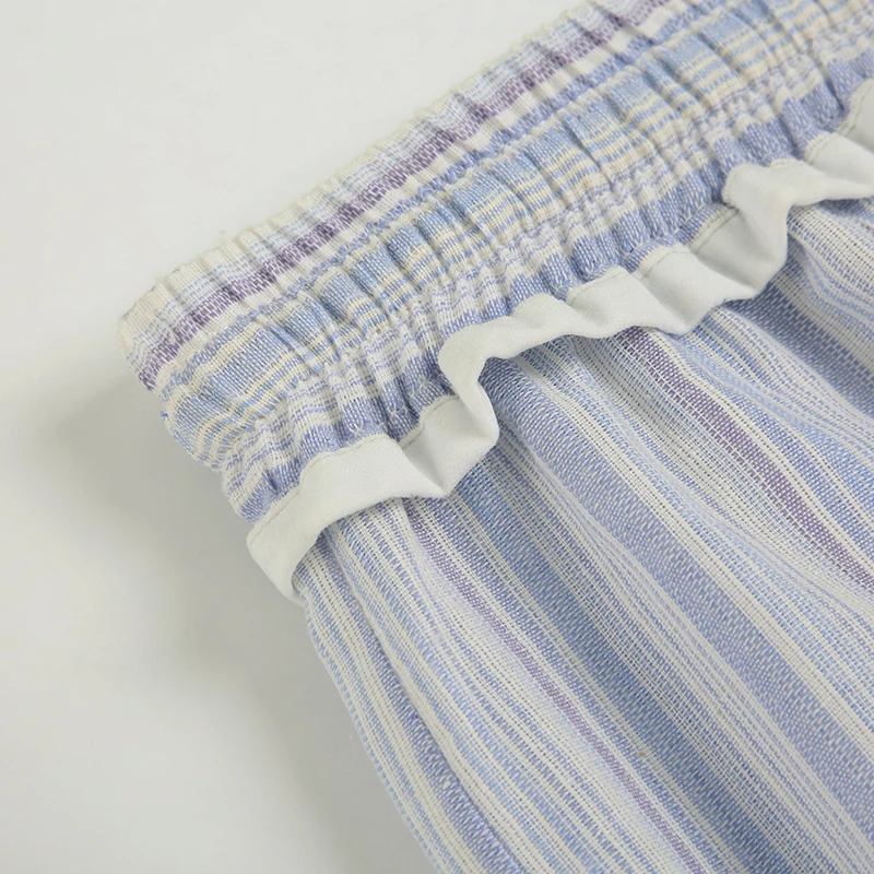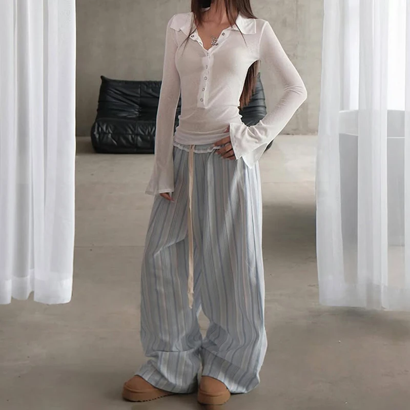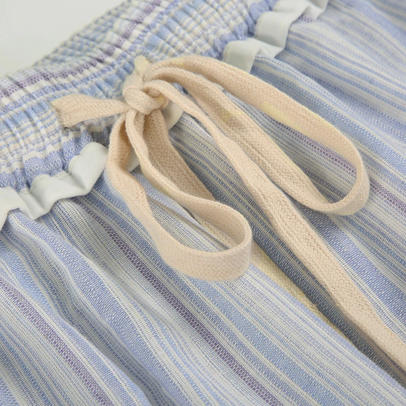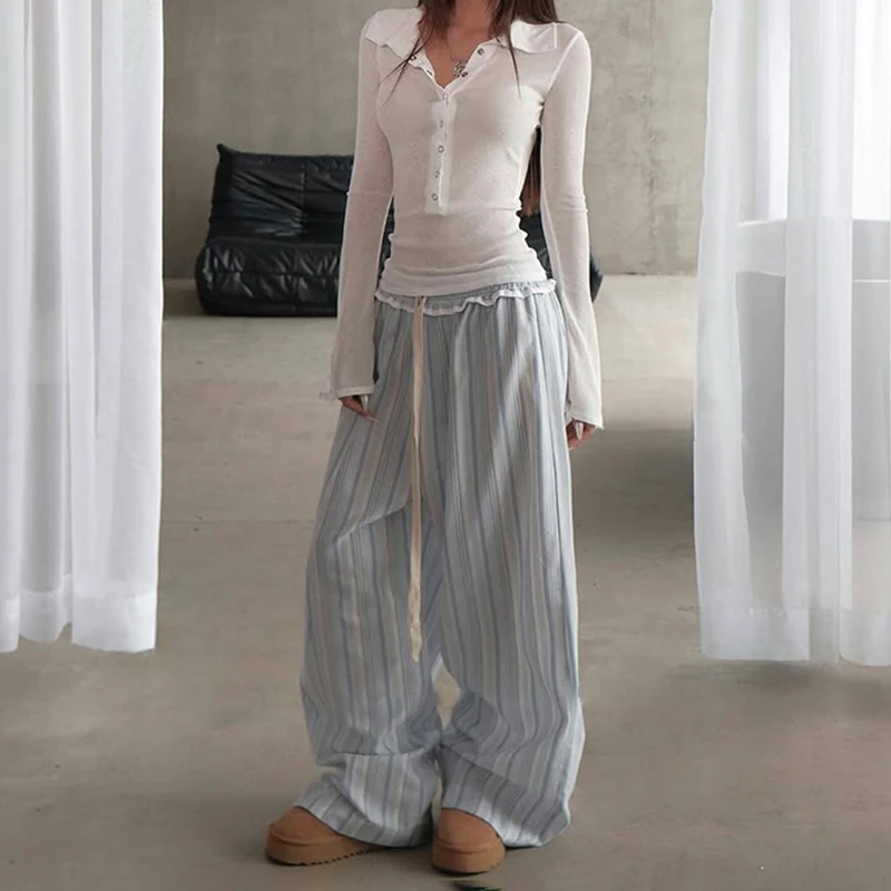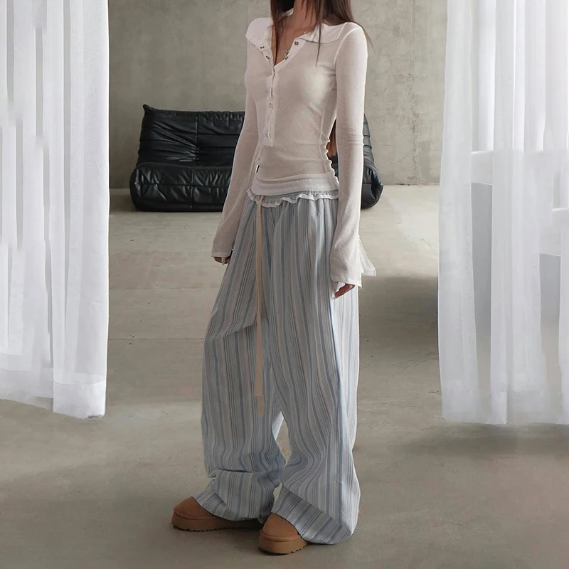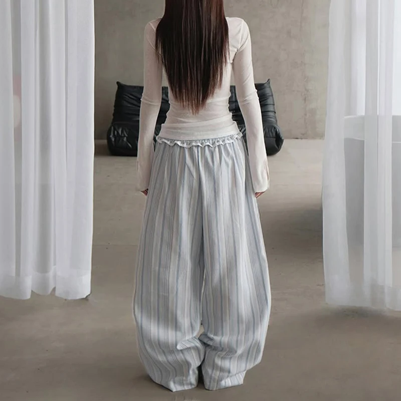 fashion Stringy Selvedge Stripe Casual Pants Drawstring Basic All-match Vintage Blue Chic Trousers Vacation Loose Bottoms