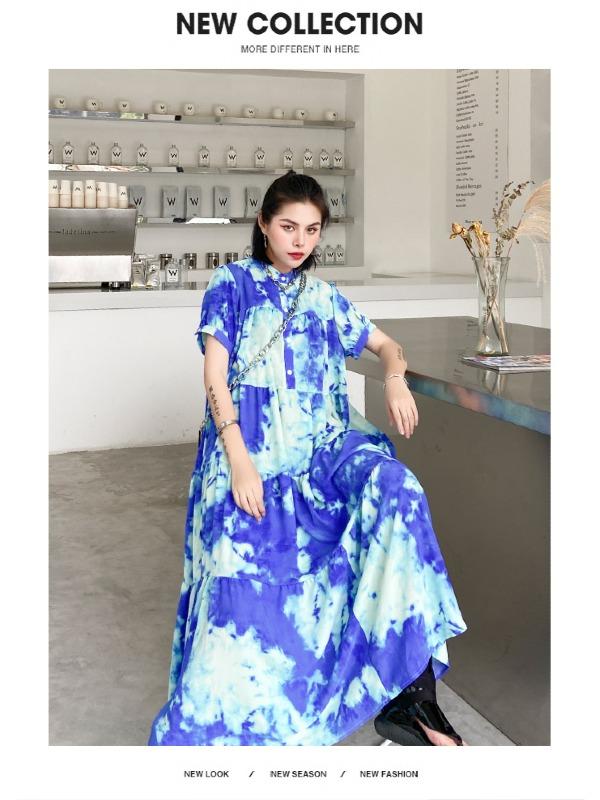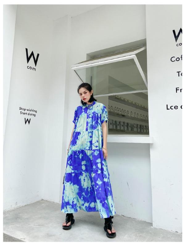 Fashion Tie-Dyed Bishop Sleeve A-Line Dress