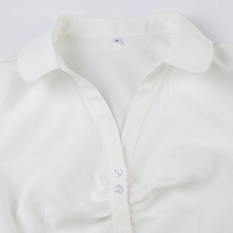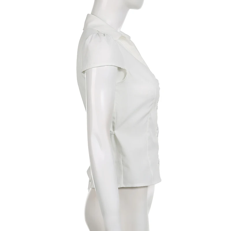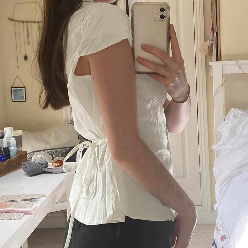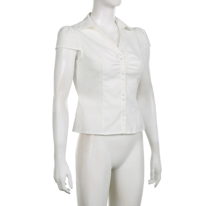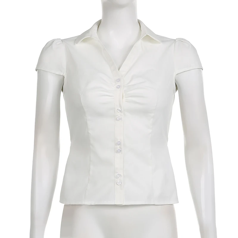 fashion Turn-Down Neck Solid Tee Shirts for Women Short Sleeves Aesthetic Y2K Tops Vintage Fashion Ruched Lace-up Clothes