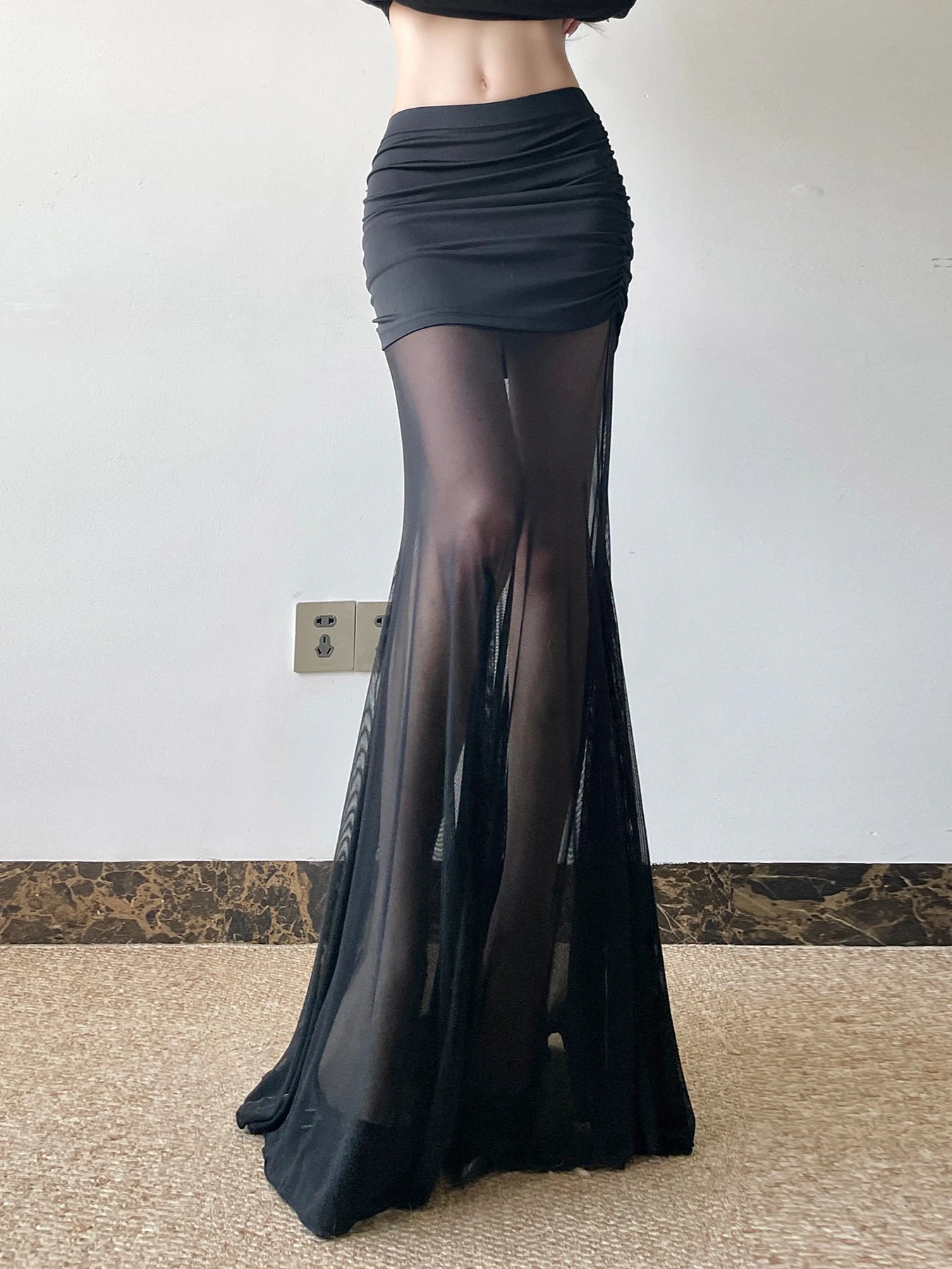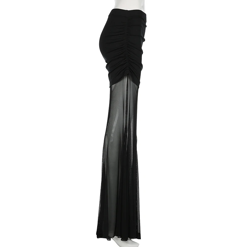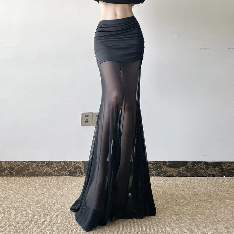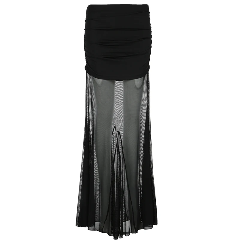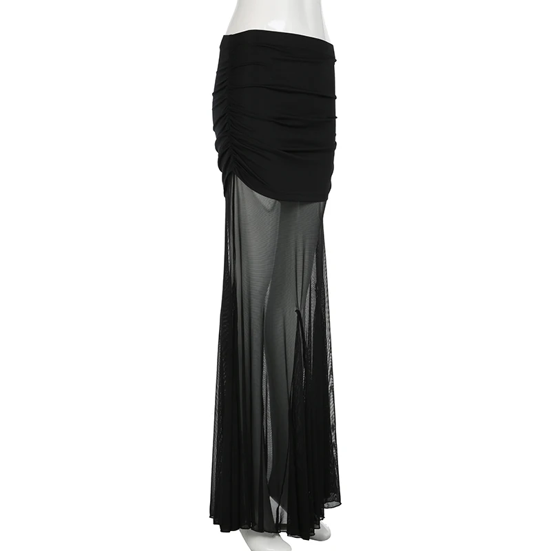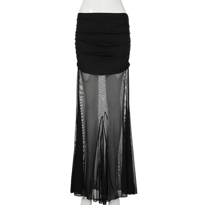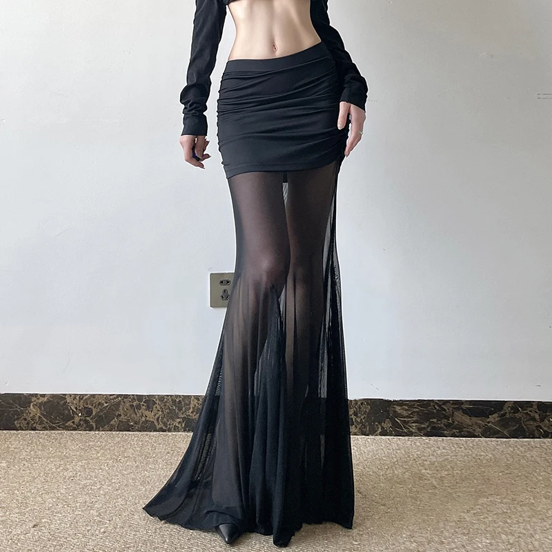 fashion Vintage Sexy Solid Mesh Skirts Low Waisted Aesthetic Korean Outfits Clubwear Long Black Knitted Women's Bottom