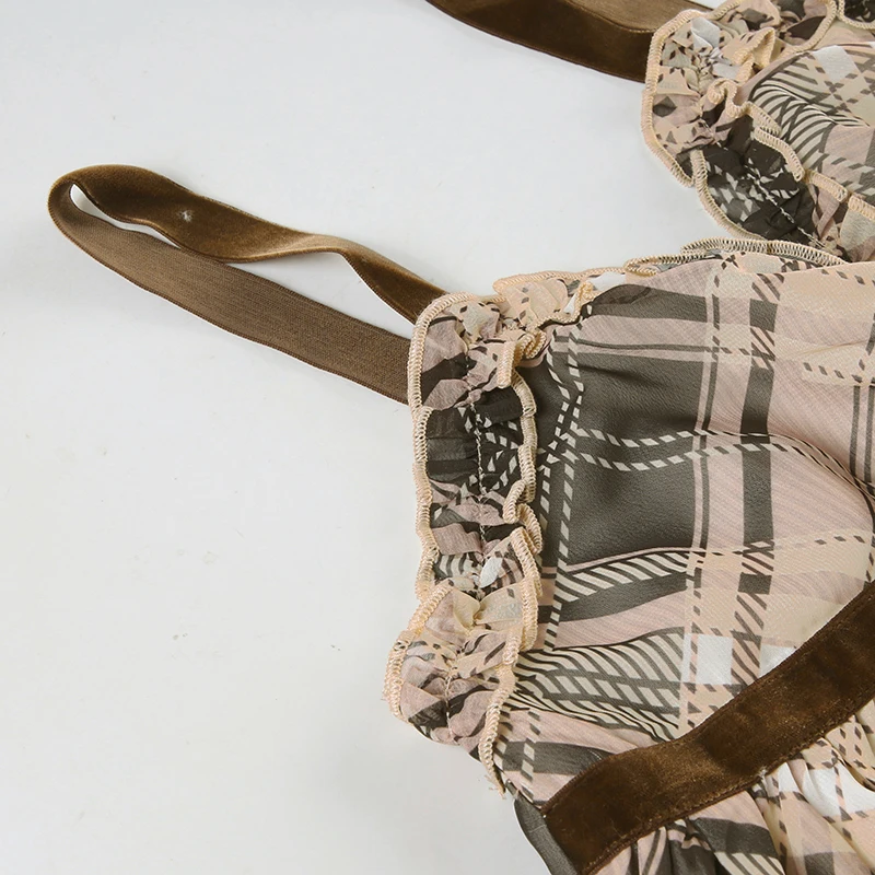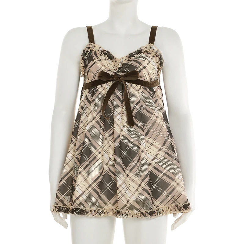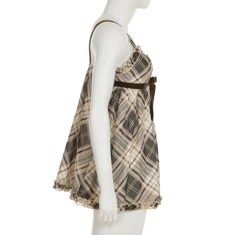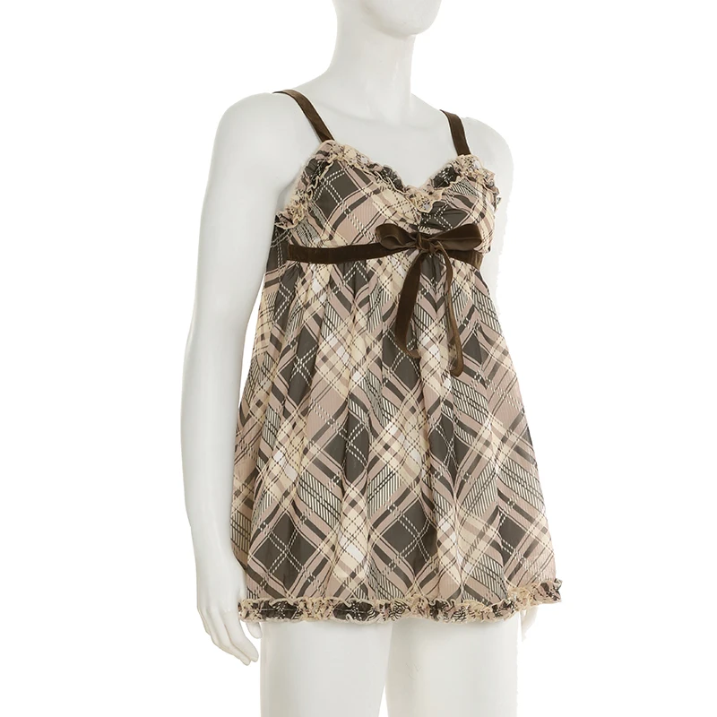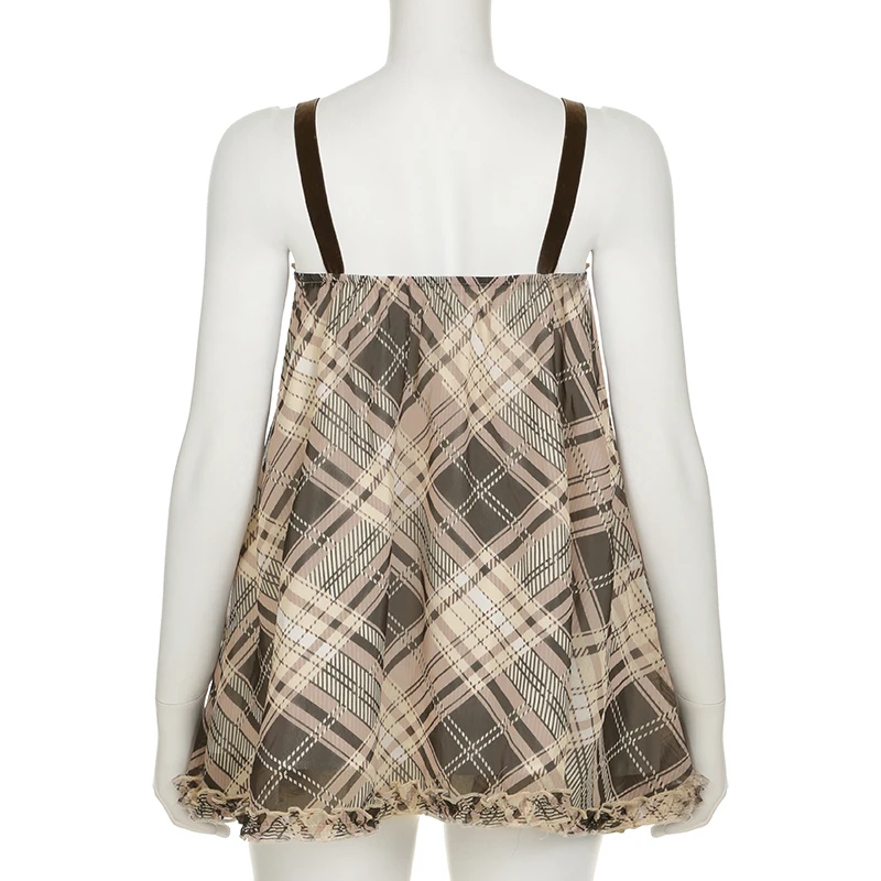 fashion Vintage Y2K Plaid Print Camisole Ruched Harajuku Aesthetic A-line Tops Sleeveless Retro Cute Korean Outfits