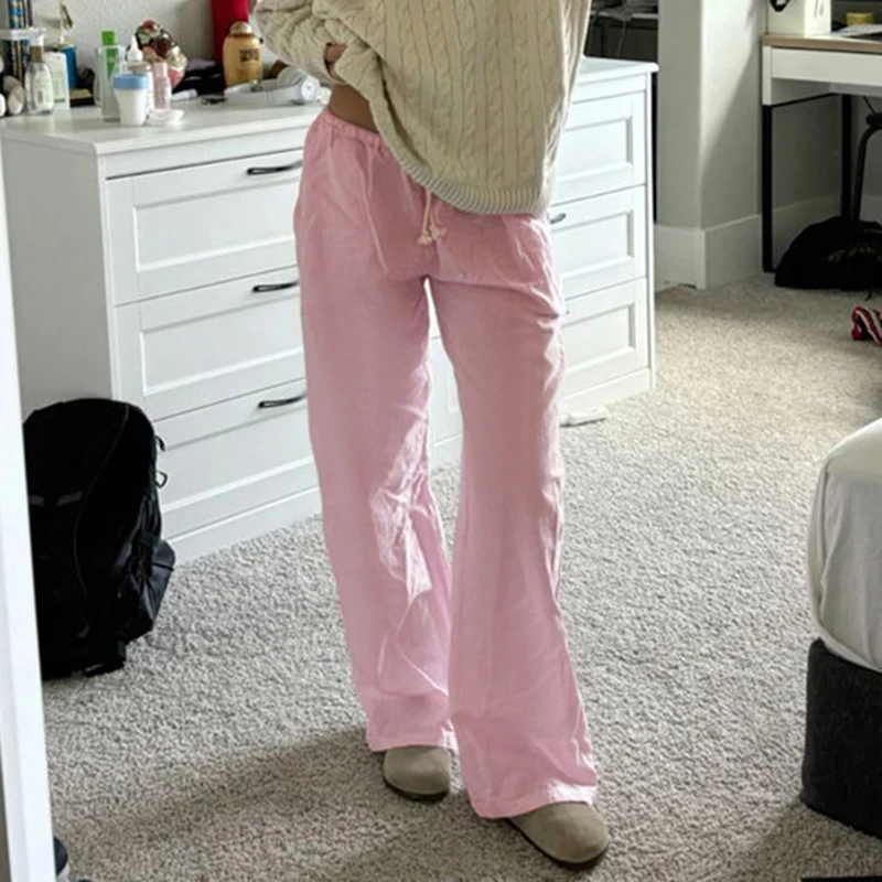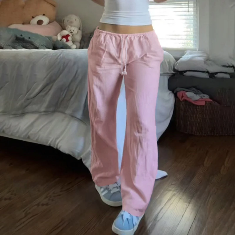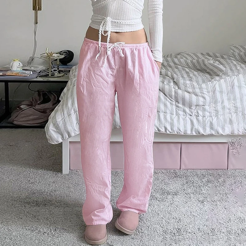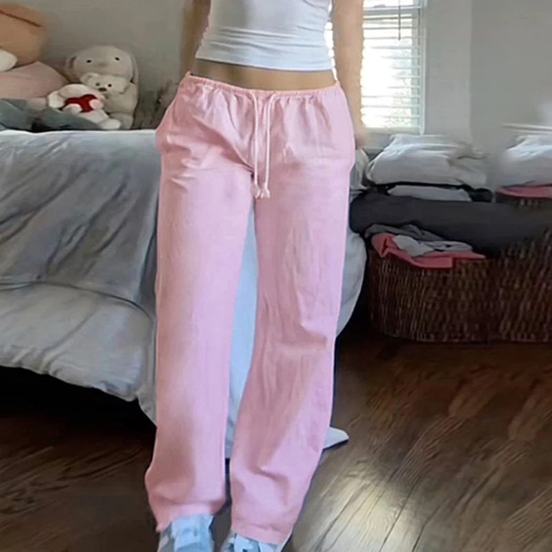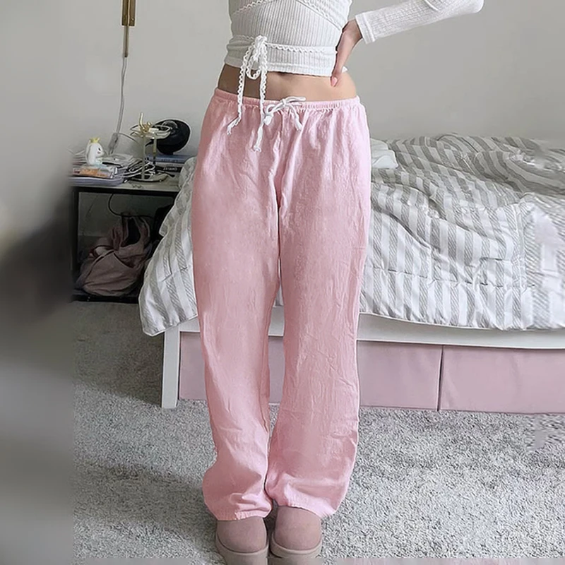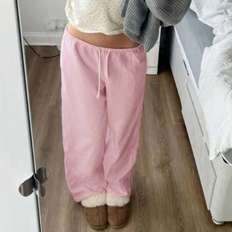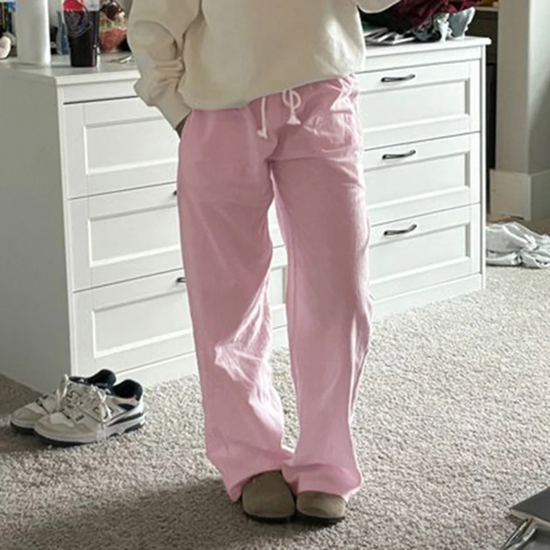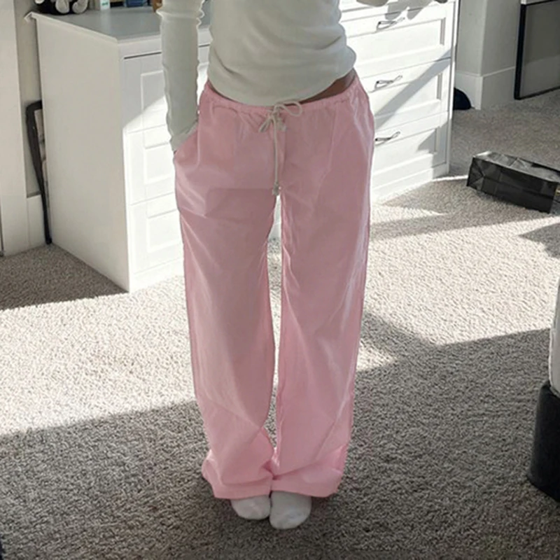 fashionCasual Solid All-match Drawstring Pants Chic Streetwear Korea Slim Straight Sweet Trousers Pink Basic Y2k Bottoms