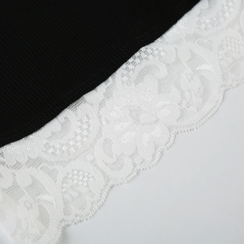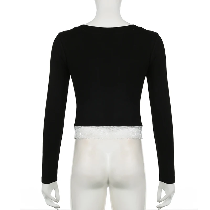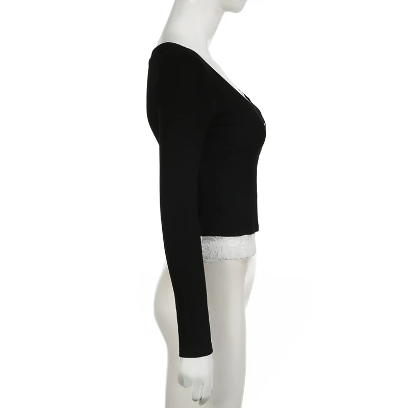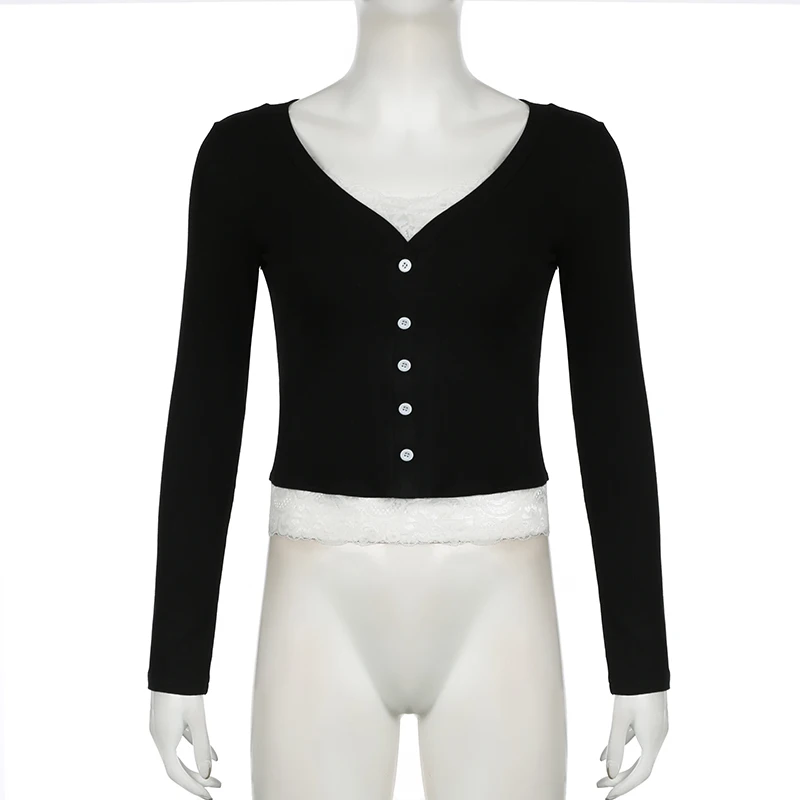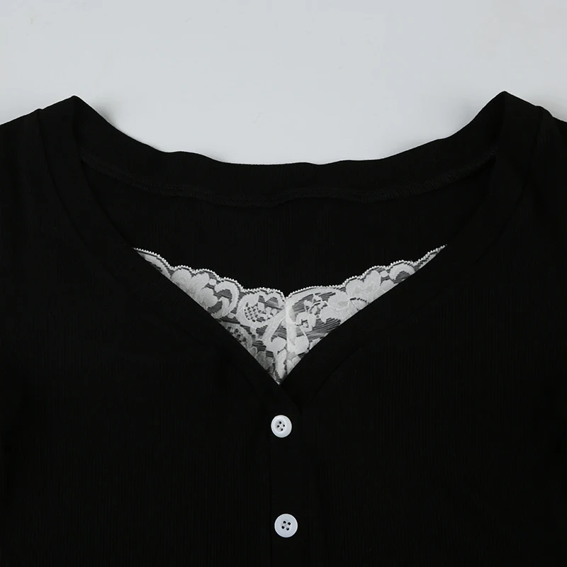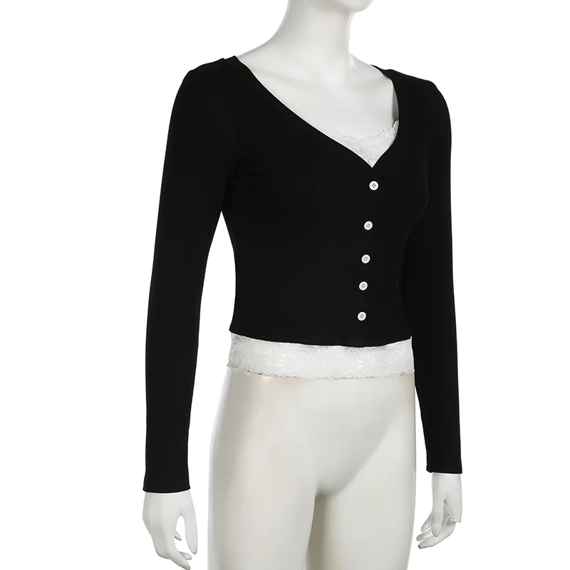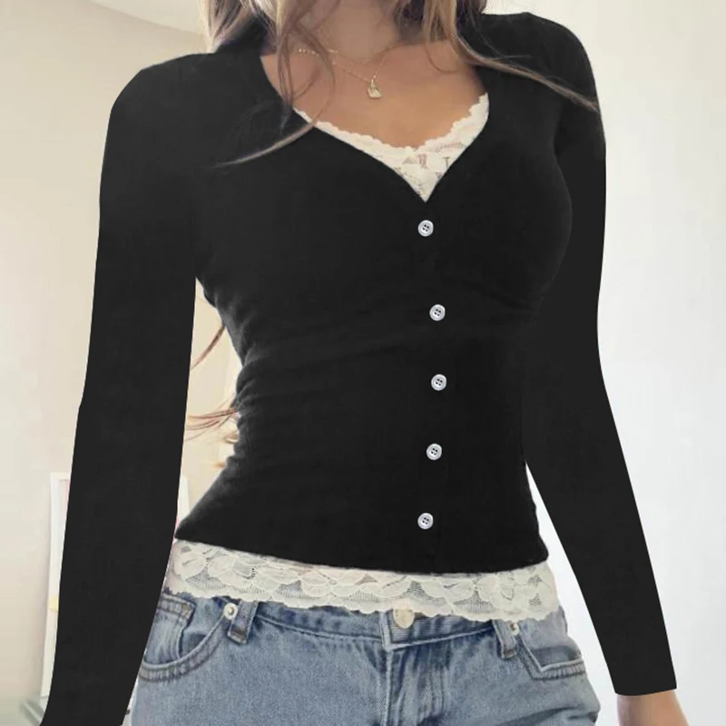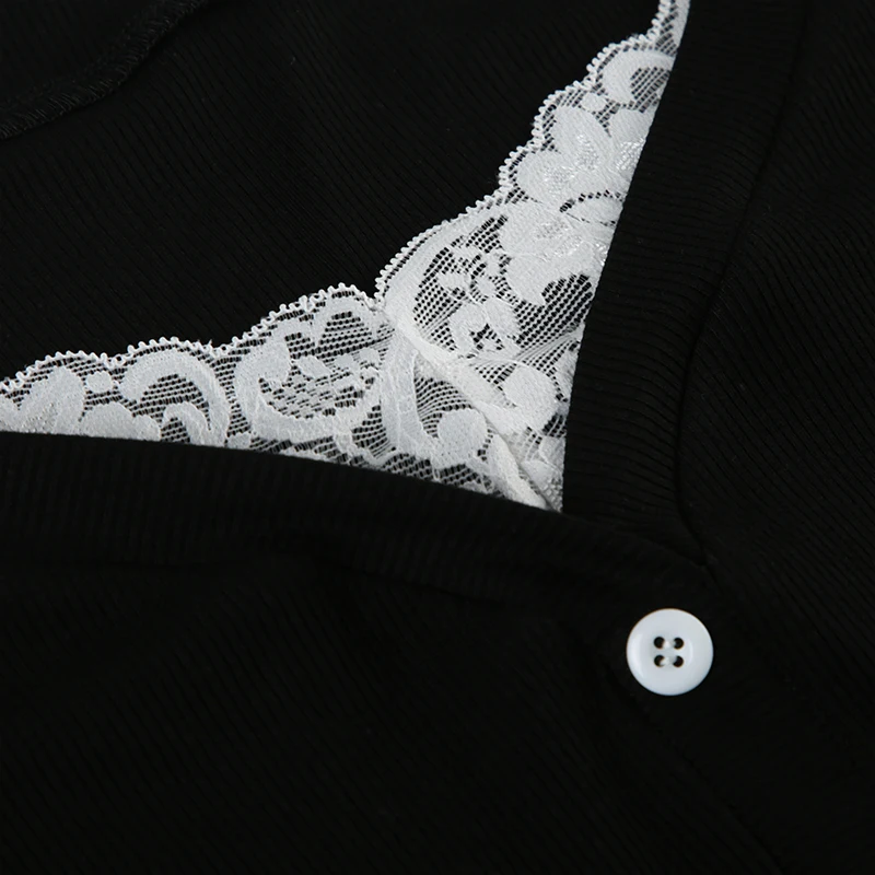 fashionColor Contrast Lace Patchwork Fake Two Pieces Tops Button Slim Casual Streetwear Clothes Basic Bodycon 90s Outfits