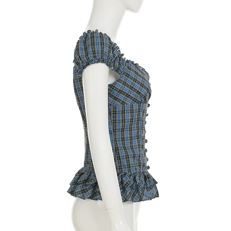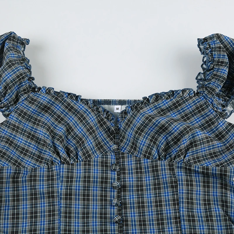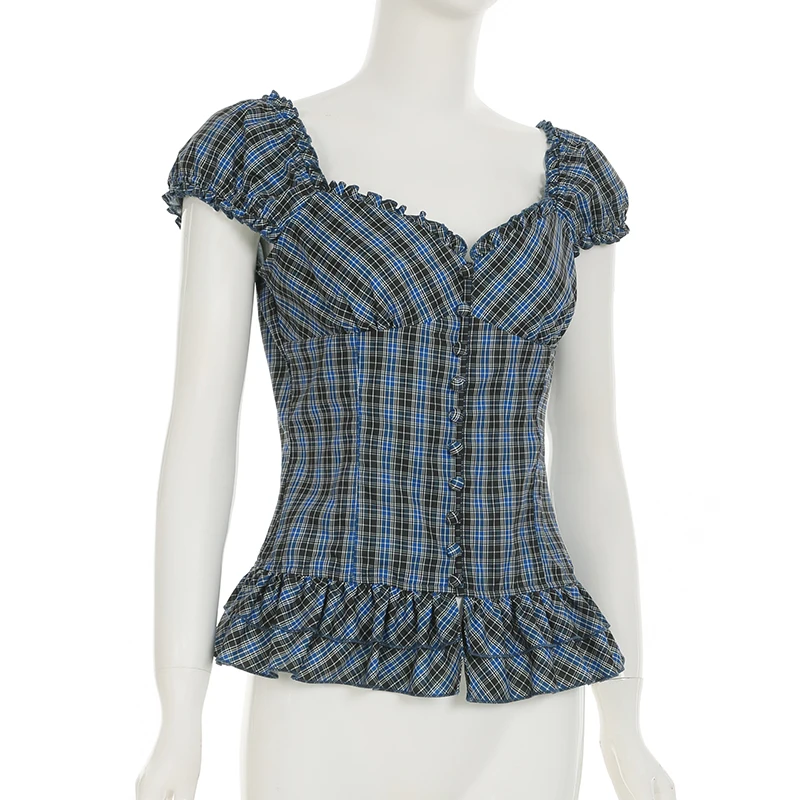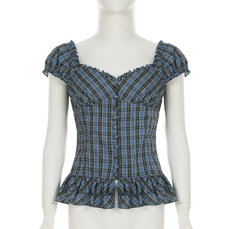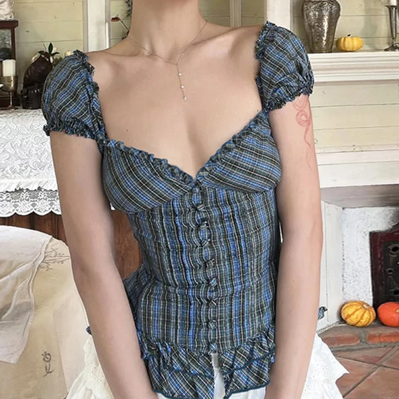 fashionFrench Plaid Print Slim Sexy Blouses Square Collar Button Chic Bodycon Hottie Top Vintage Fashion Fold Clothes