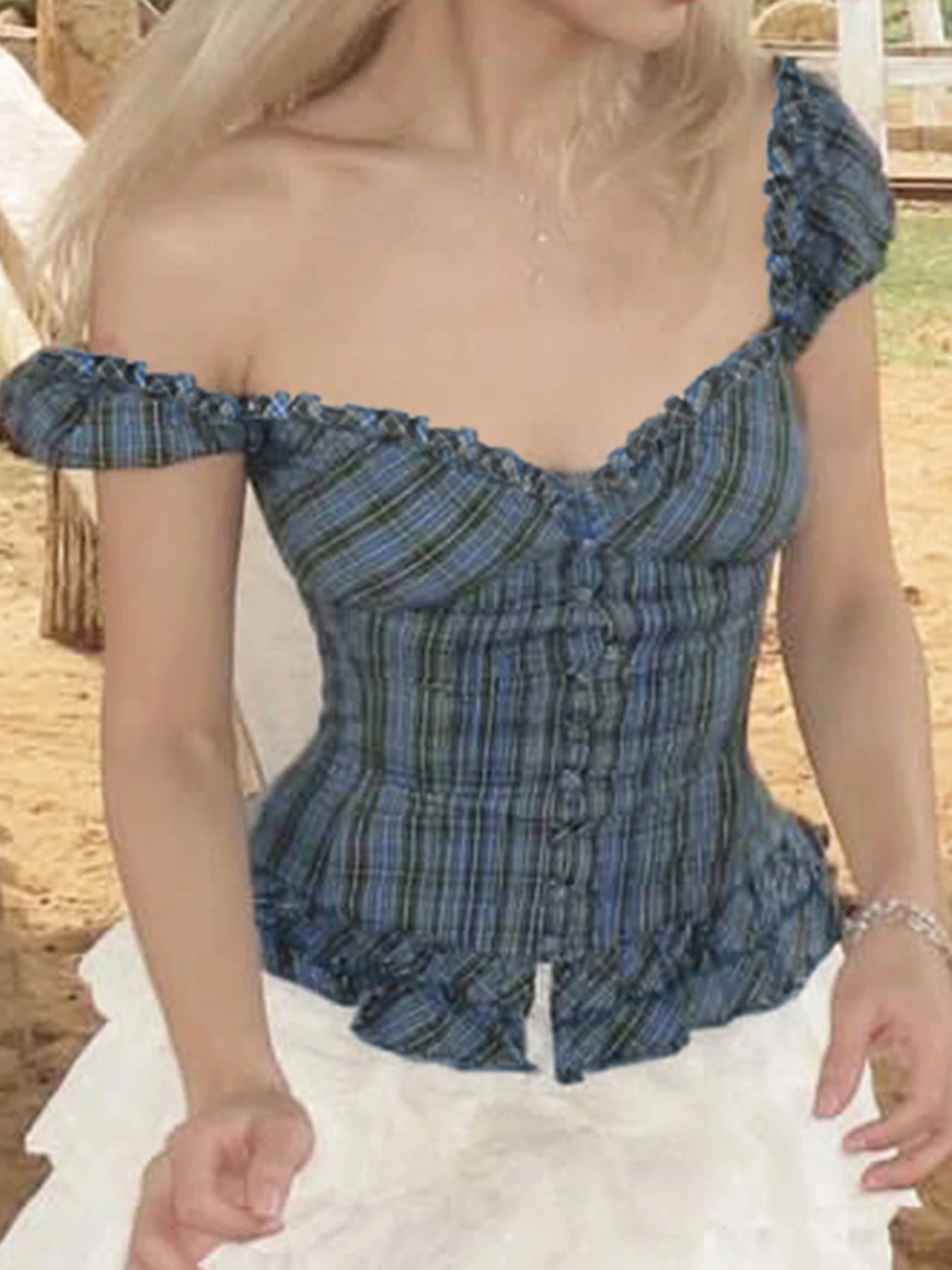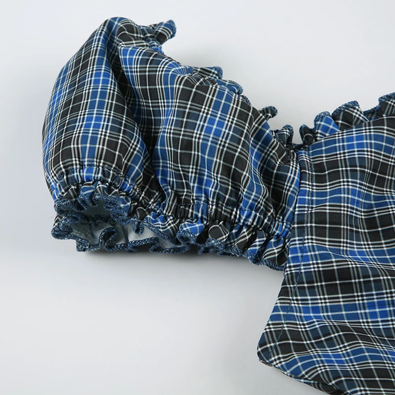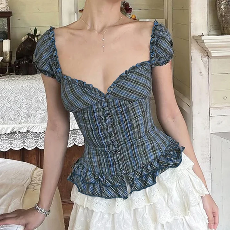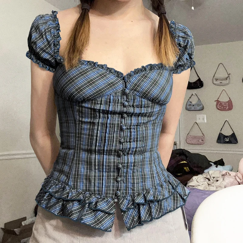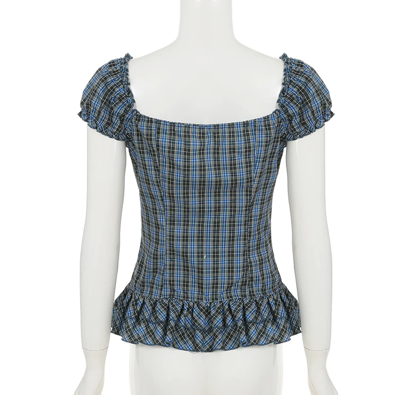 fashionFrench Plaid Print Slim Sexy Blouses Square Collar Button Chic Bodycon Hottie Top Vintage Fashion Fold Clothes