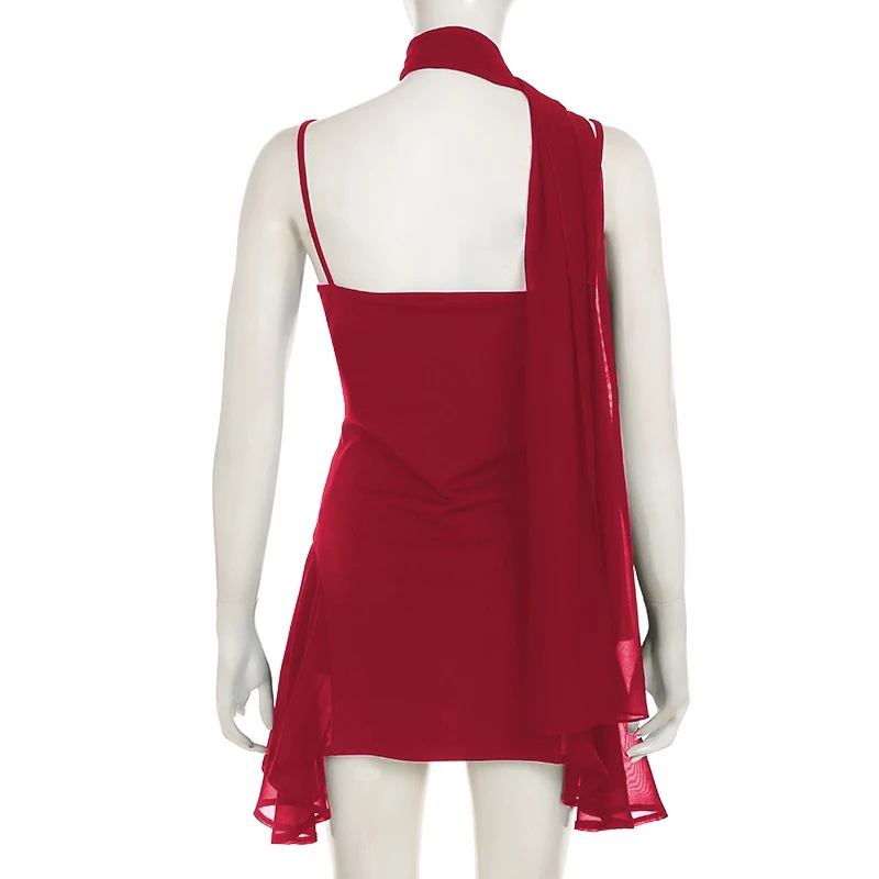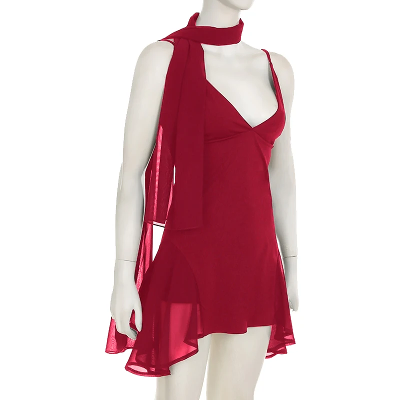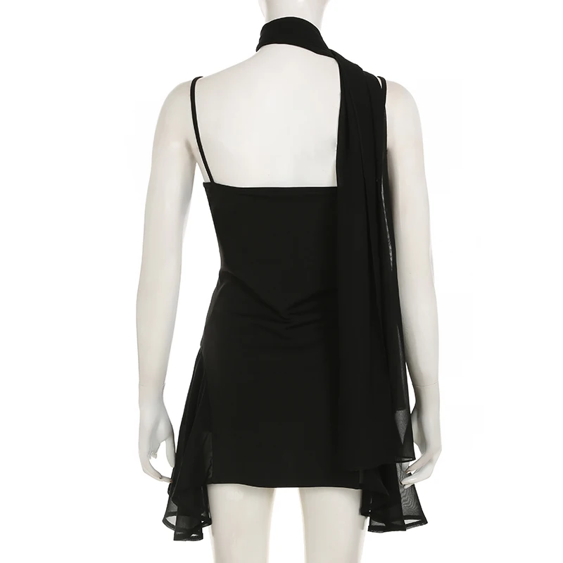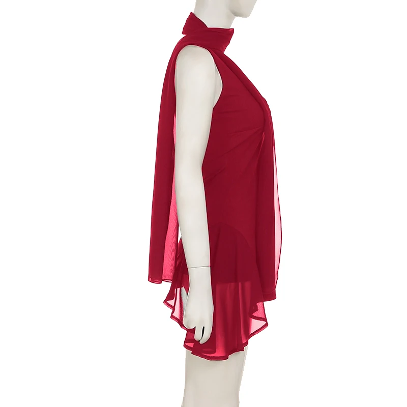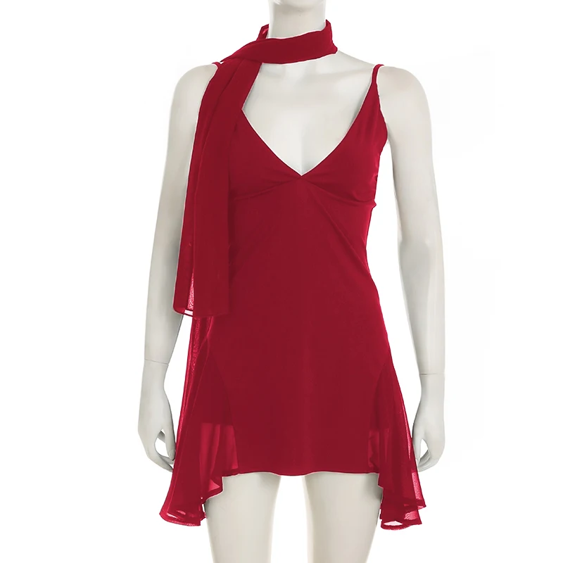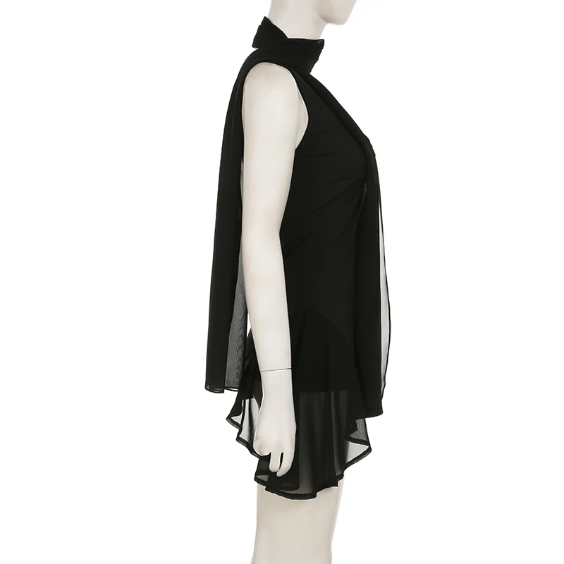 fashionIrregular A-line Vintage Solid Dress Halter Mesh Sleeveless V-neck Fashion Clothes Chic Streetwear Party Outfits