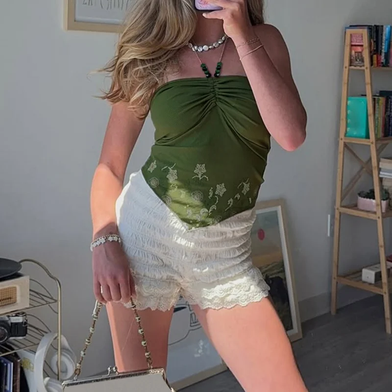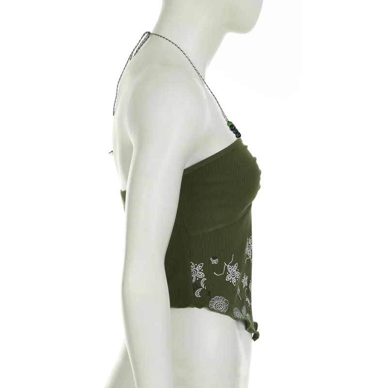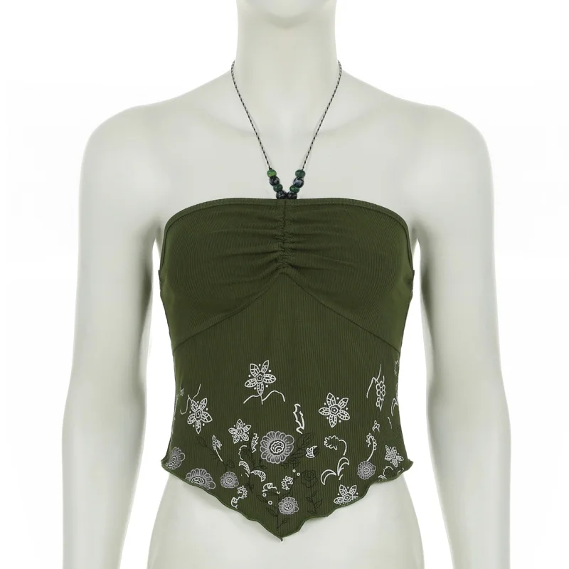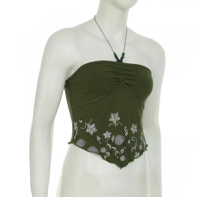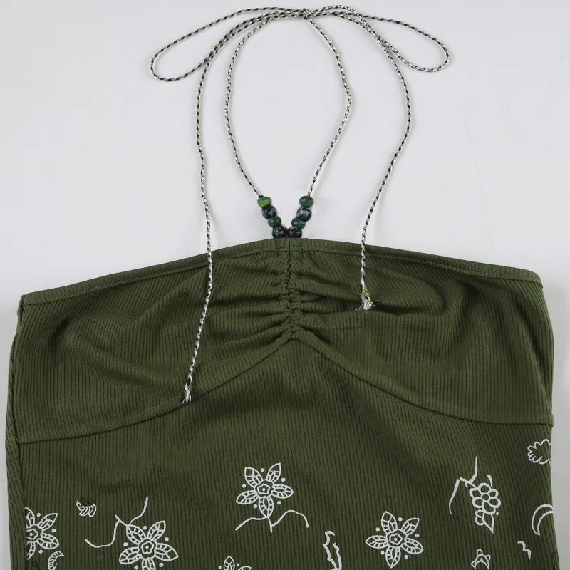 fashionRetro Floral Print Beads Sexy Camisole Vintage Streetwear Slim Backless Elastic Top Irregular Shirring Bustier