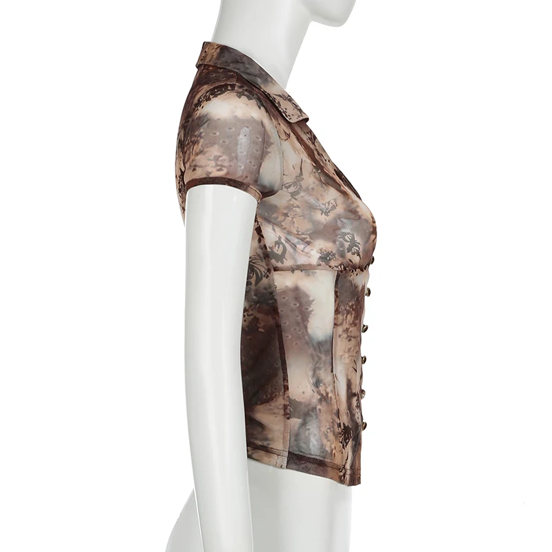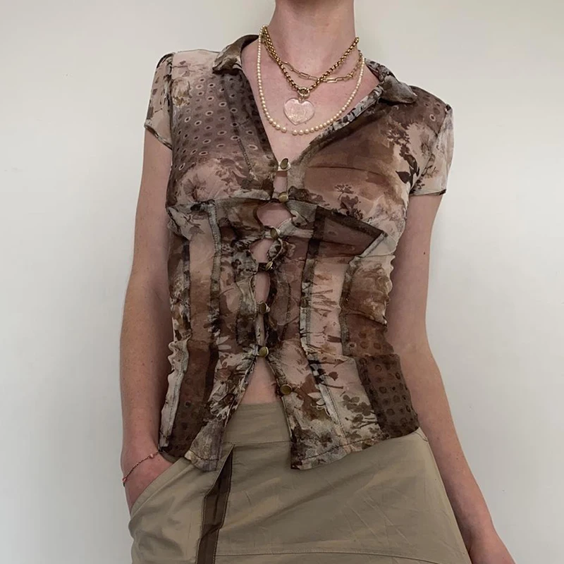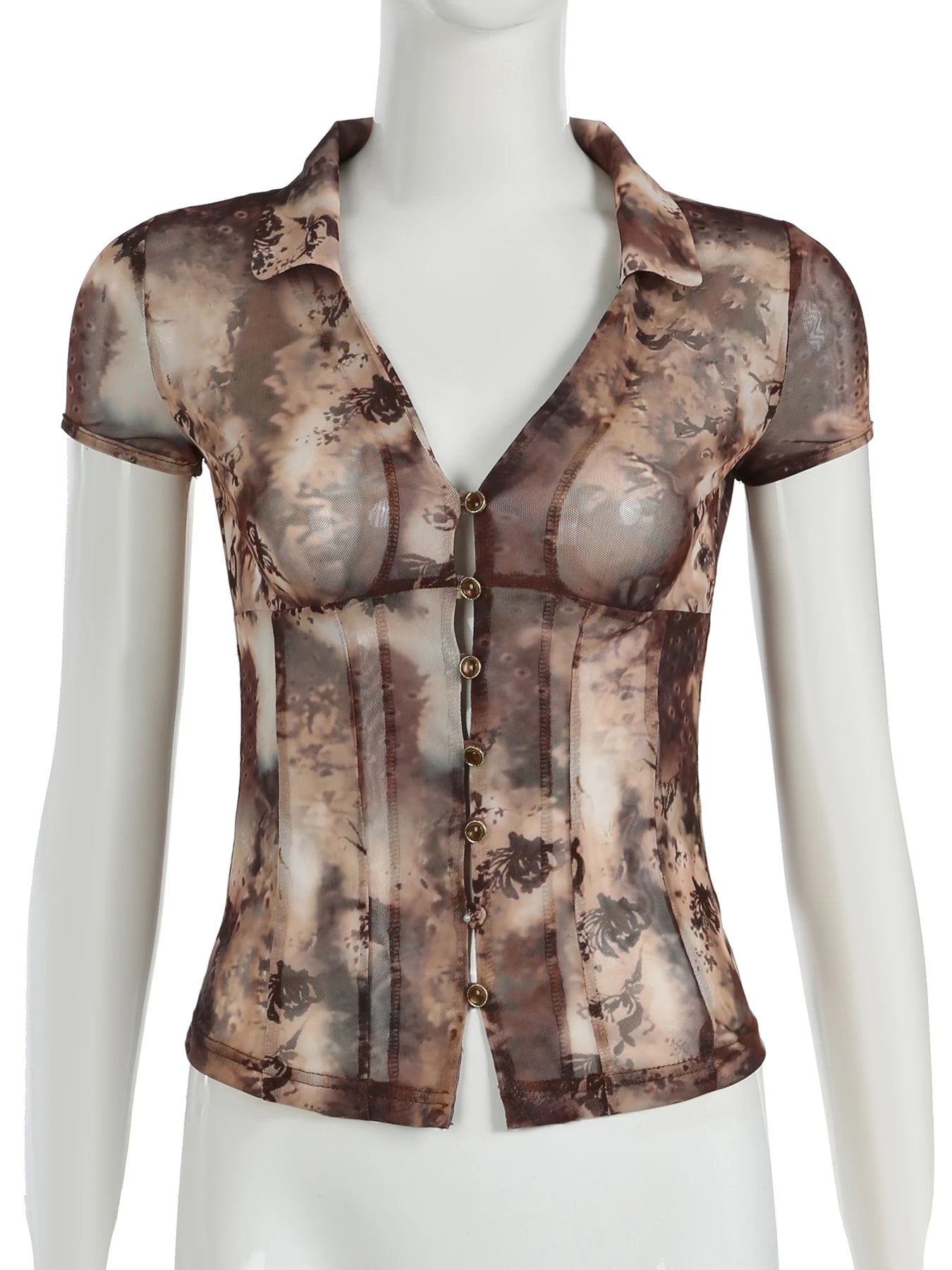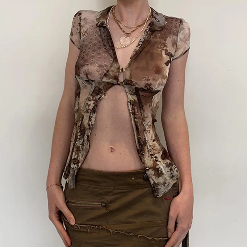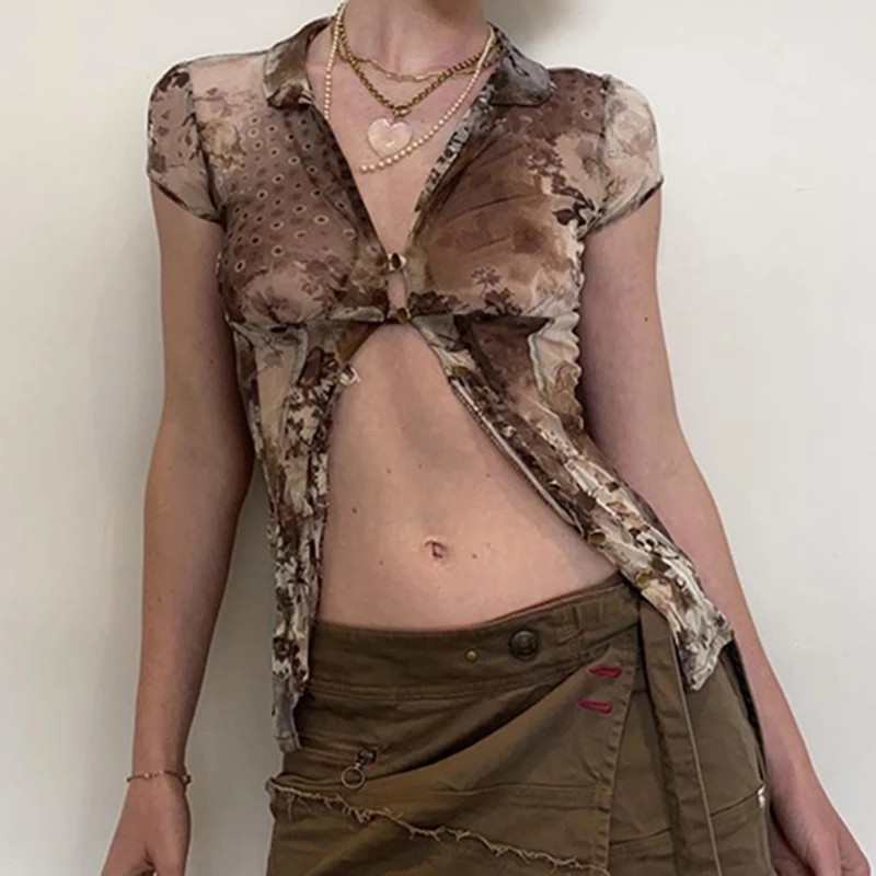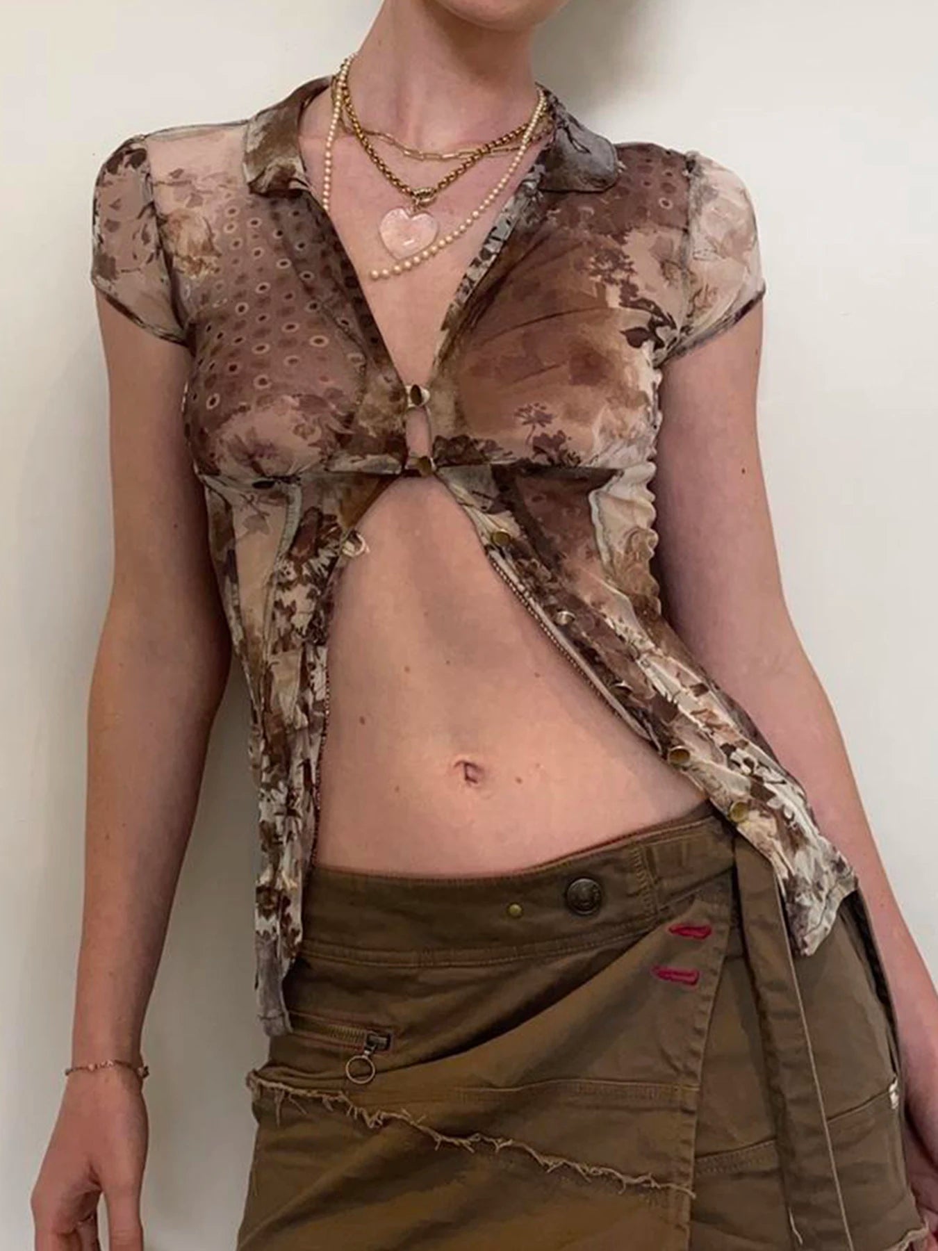 fashionRetro Floral Print Lapel Slim T-shirt Hollow Out Button Vintage Chic 90s Streetwear Tees Sexy Elastic Fashion Tops