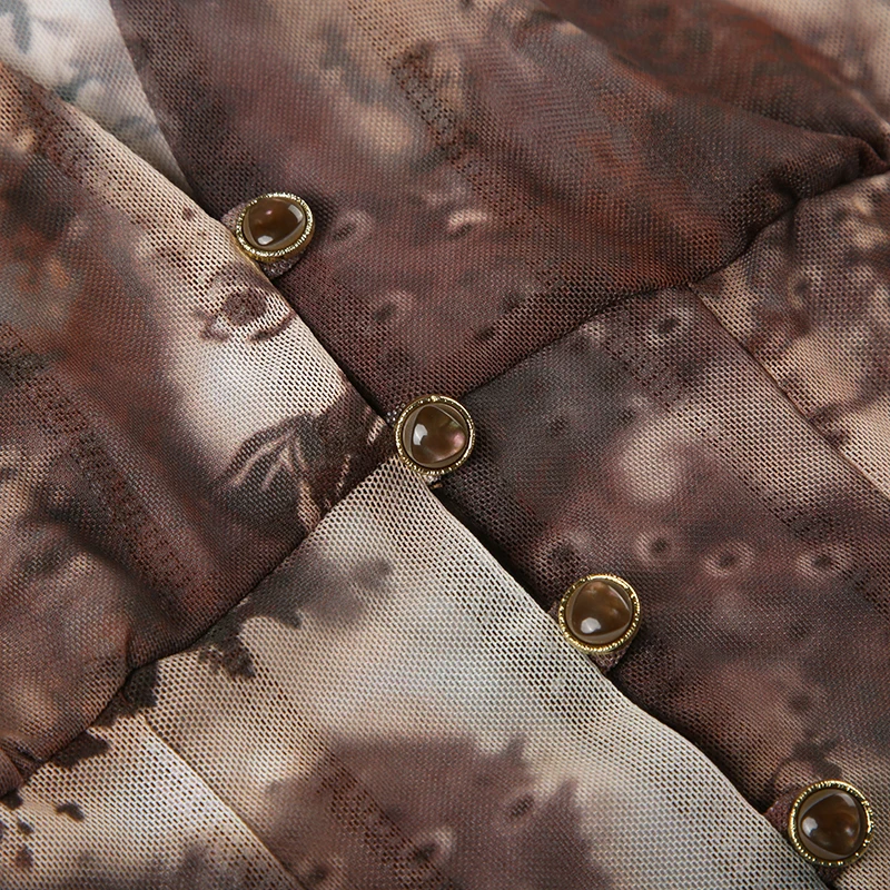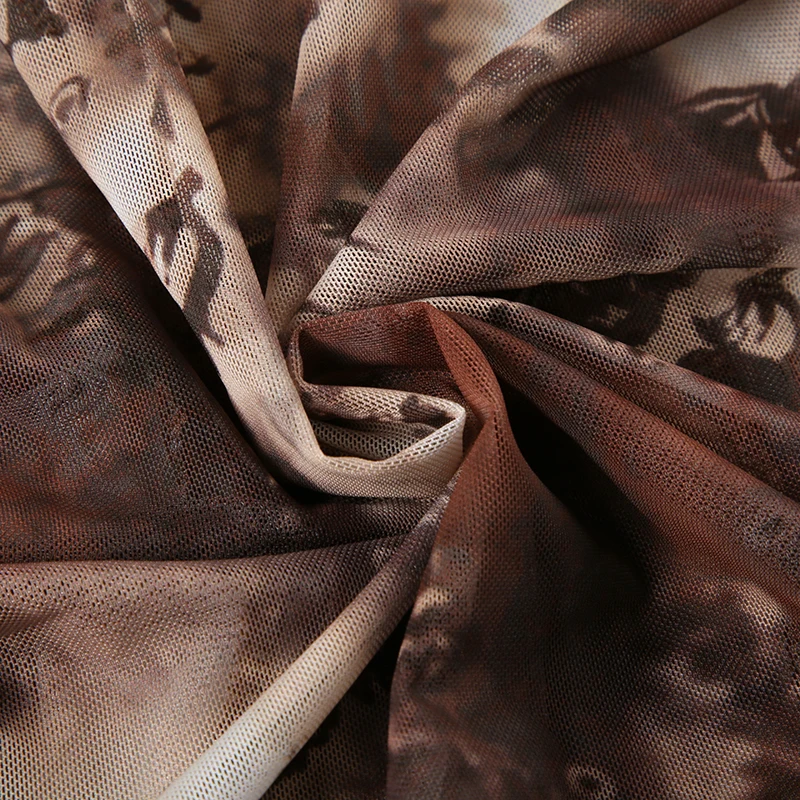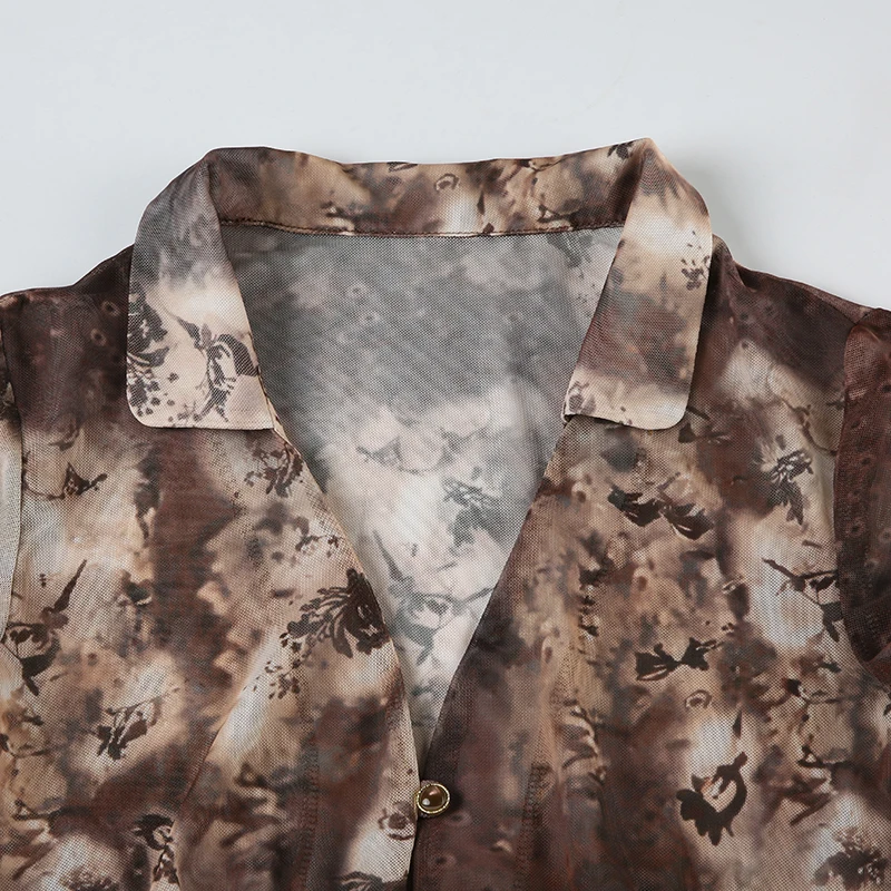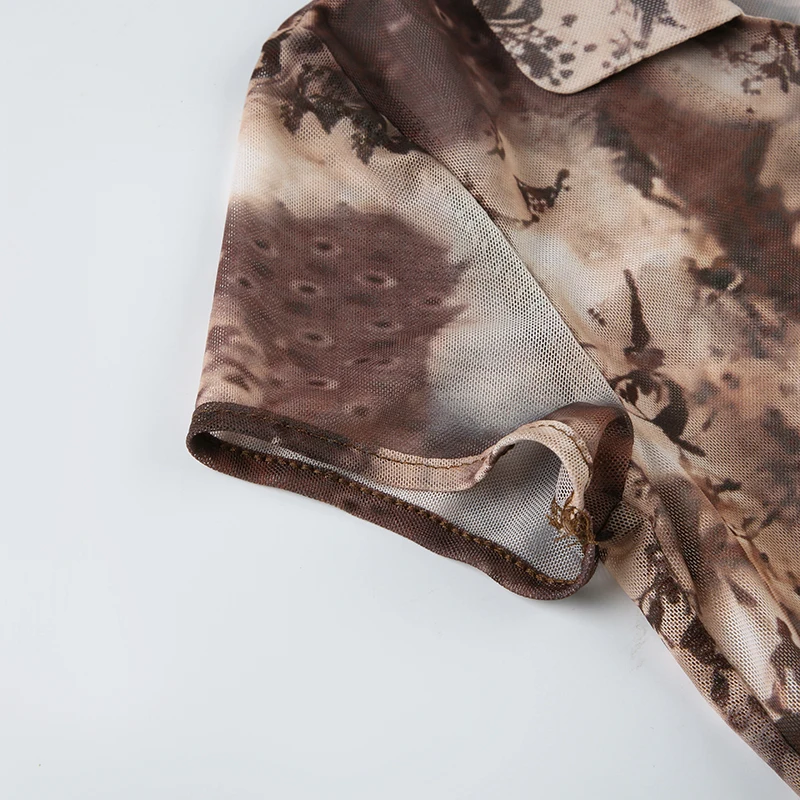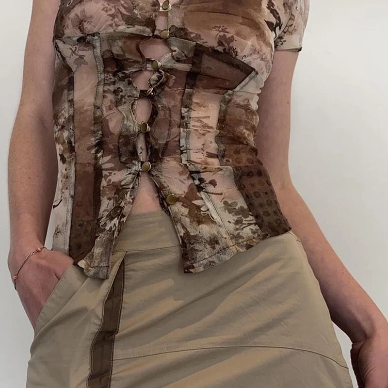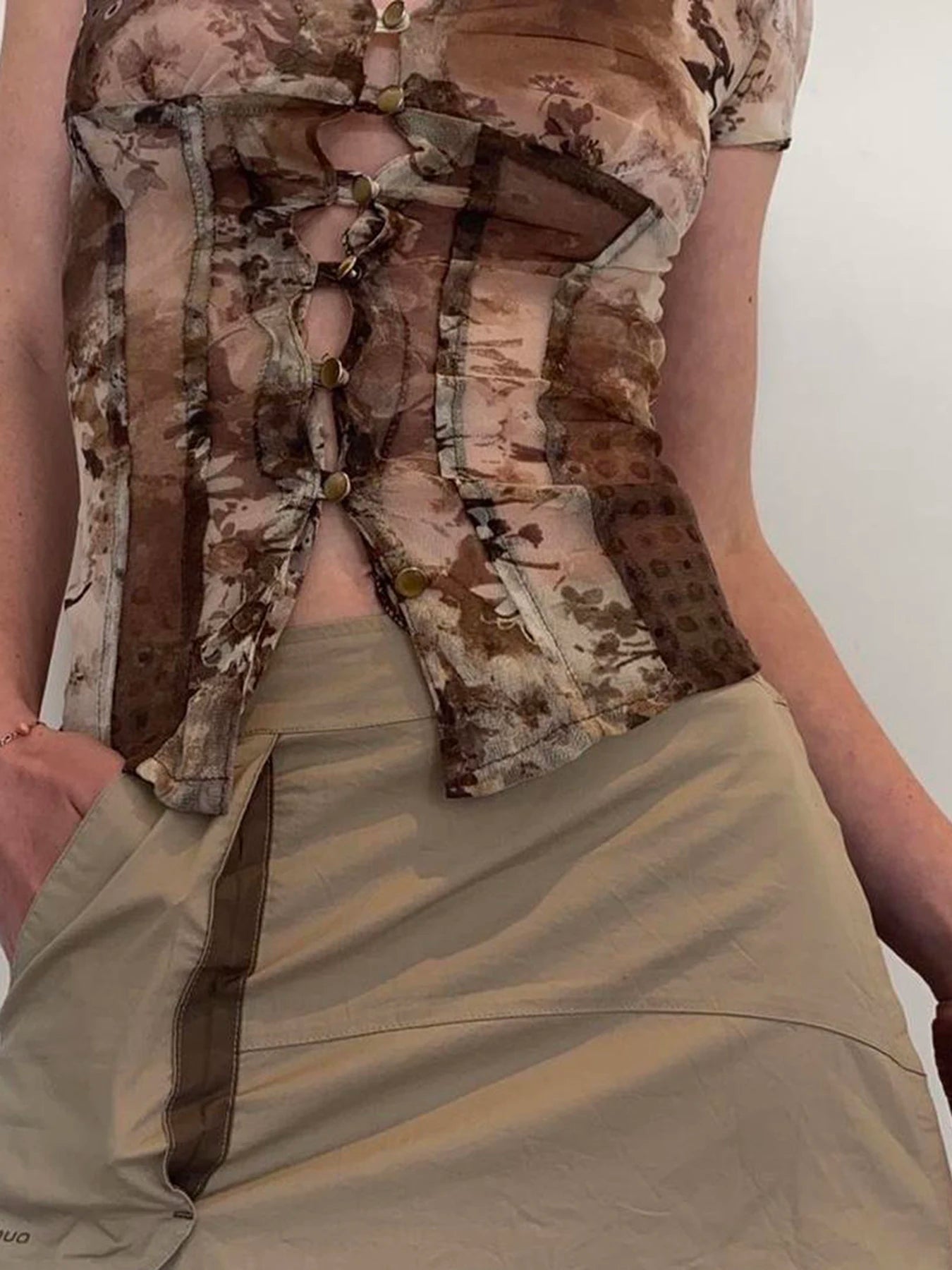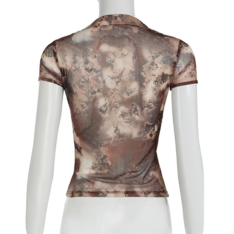 fashionRetro Floral Print Lapel Slim T-shirt Hollow Out Button Vintage Chic 90s Streetwear Tees Sexy Elastic Fashion Tops