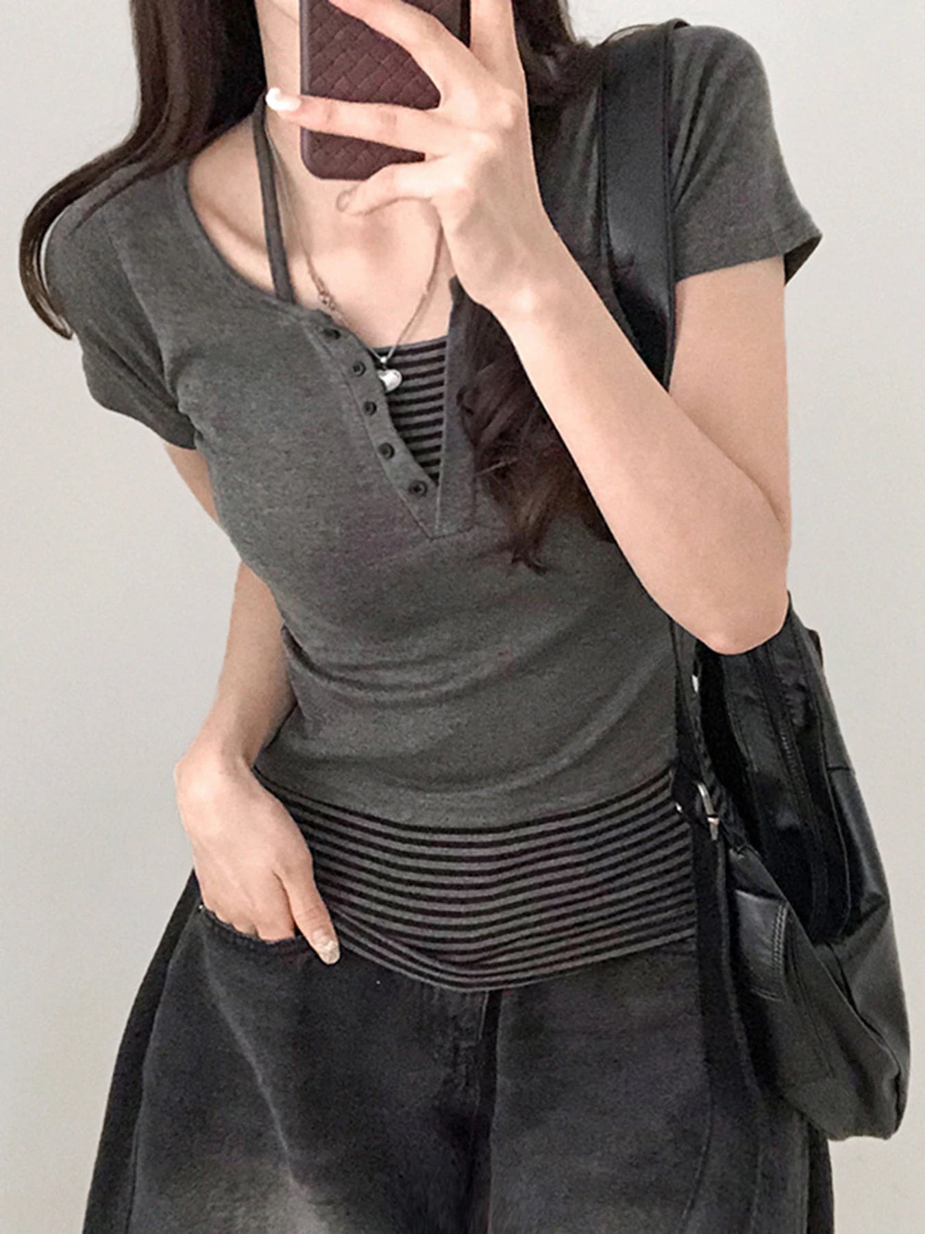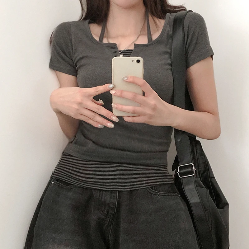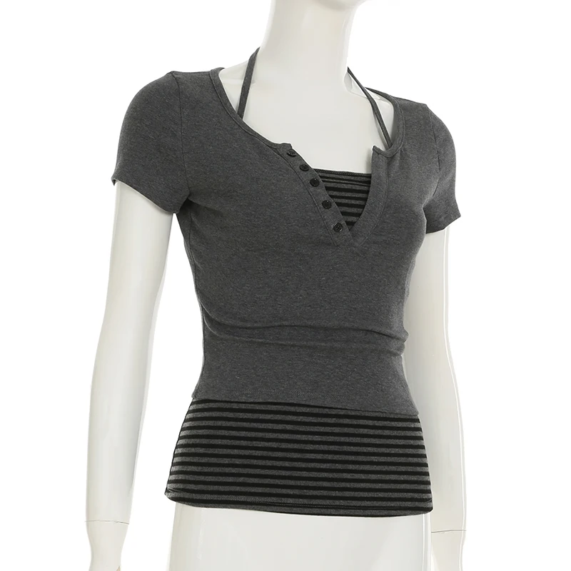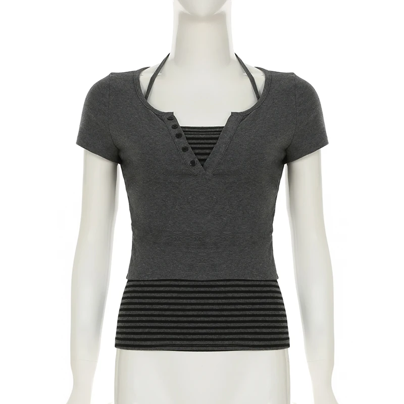 fashionStriped Button Halter Casual Two-piece Set Slim Summer Streetwear Elastic Vintage Suit Chic Basic Sexy Twinset