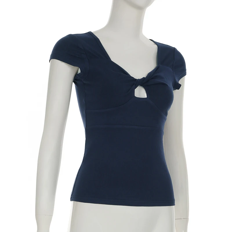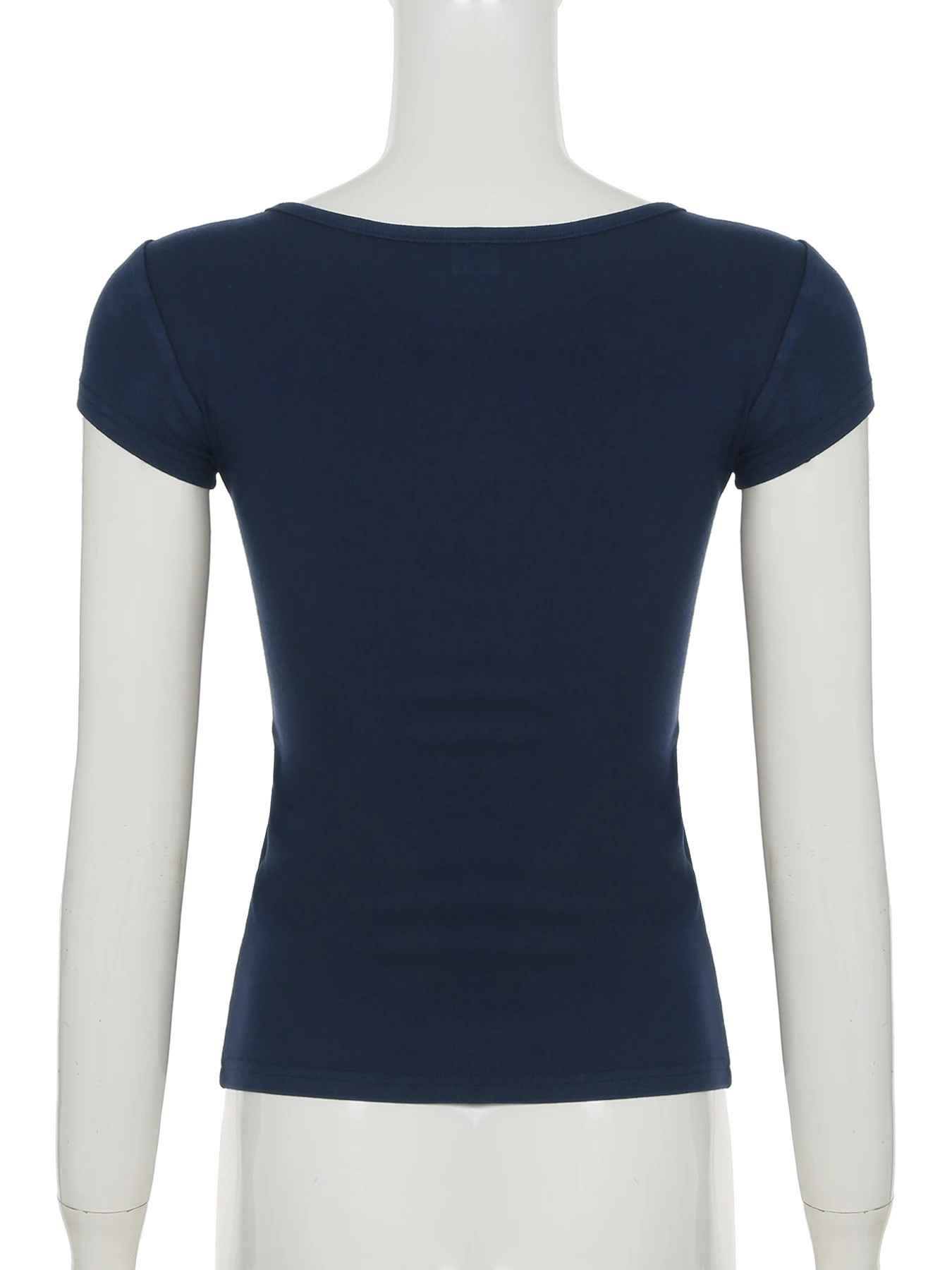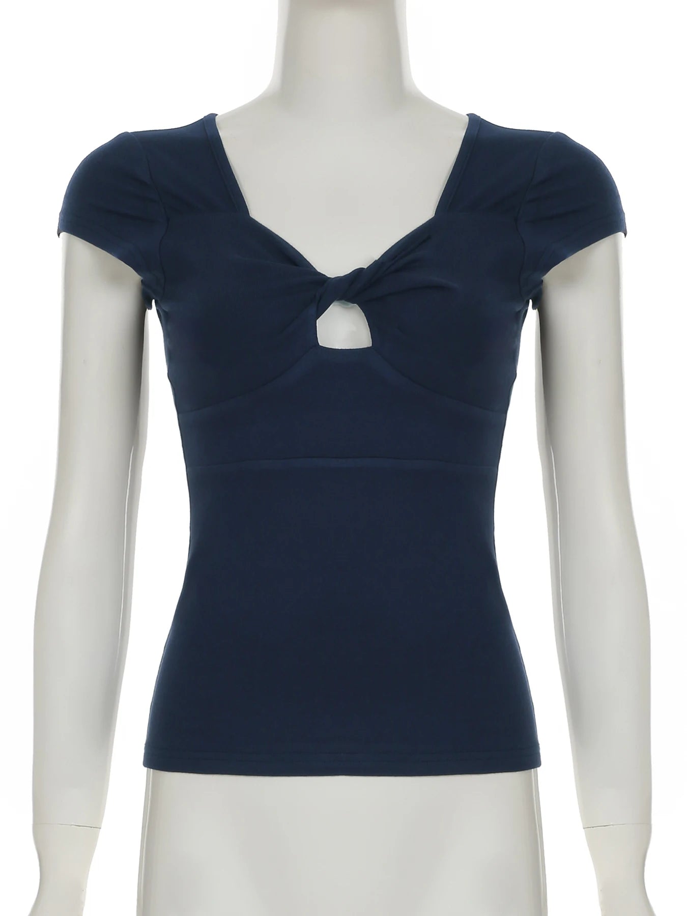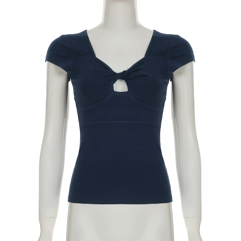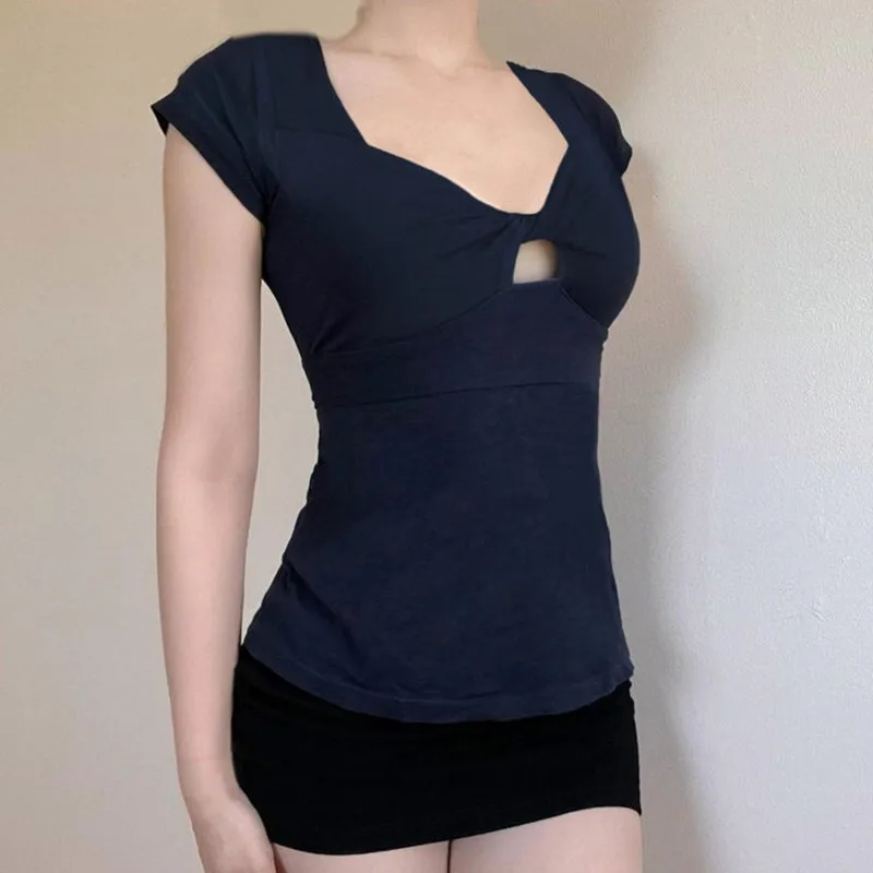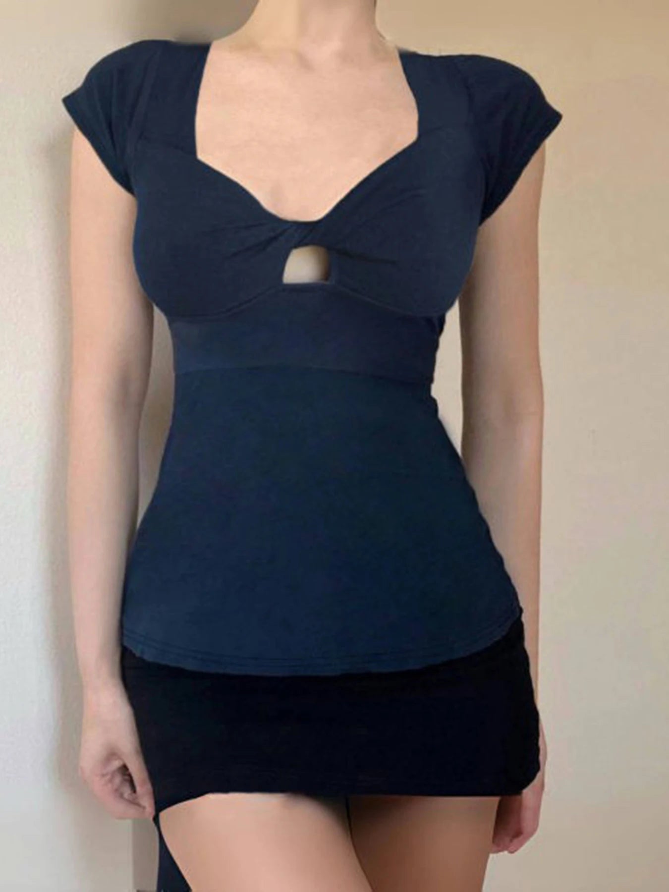 fashionTwist Square Collar Solid T-shirt Basic Vintage Hollow Out Streetwear Casual Fashion Tee Elastic Elegant Top