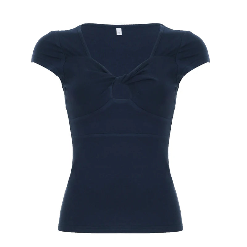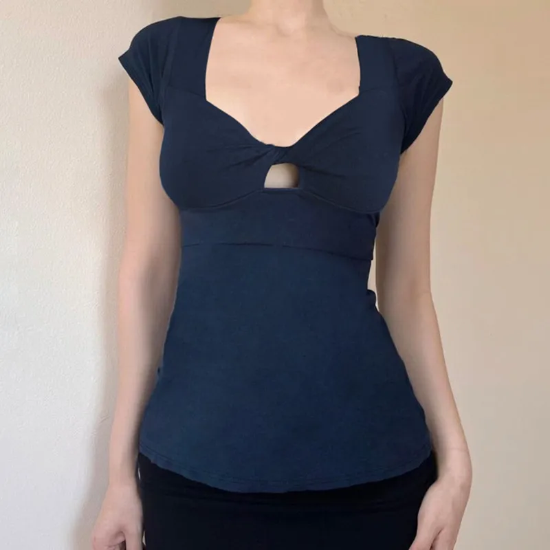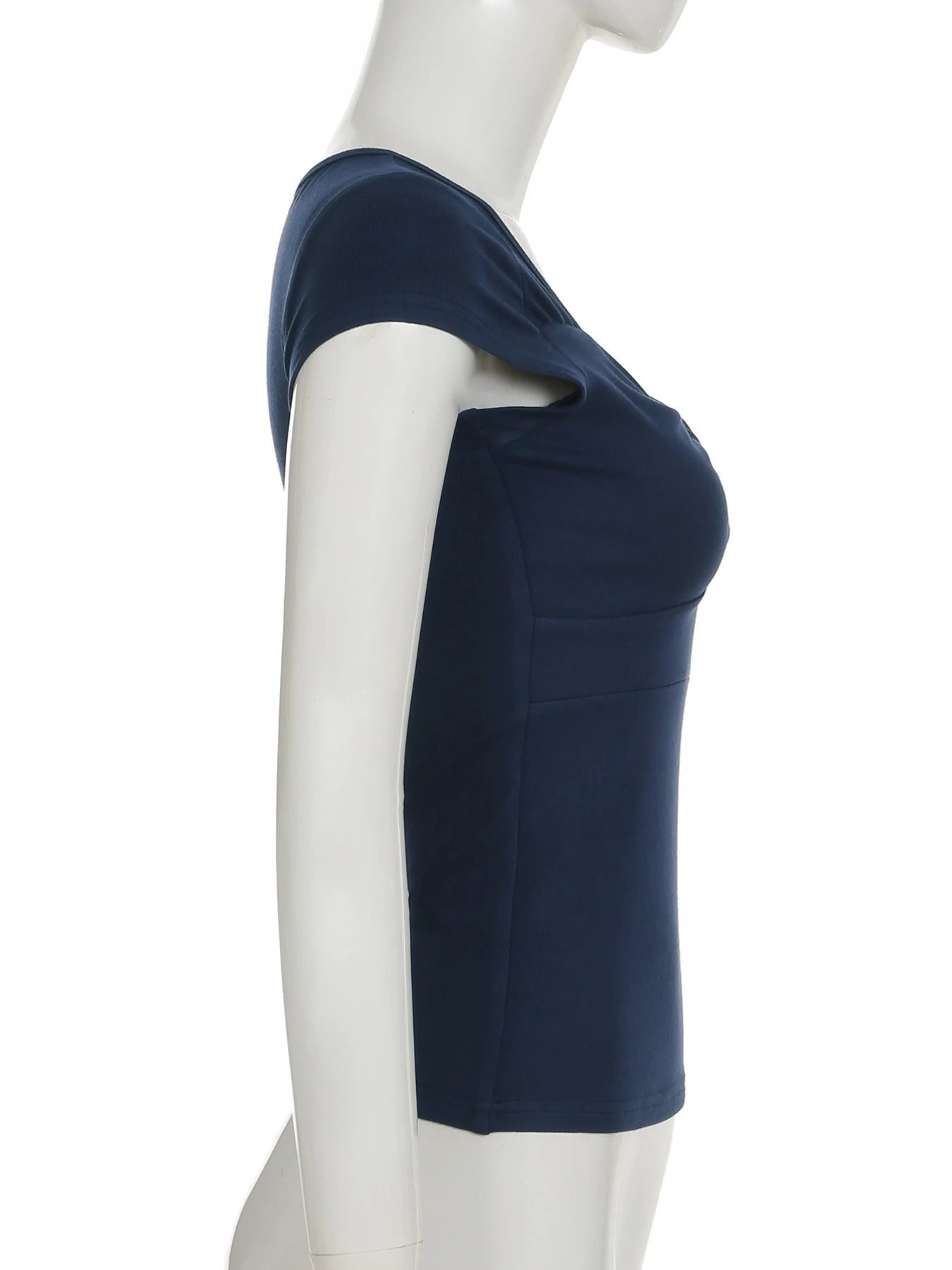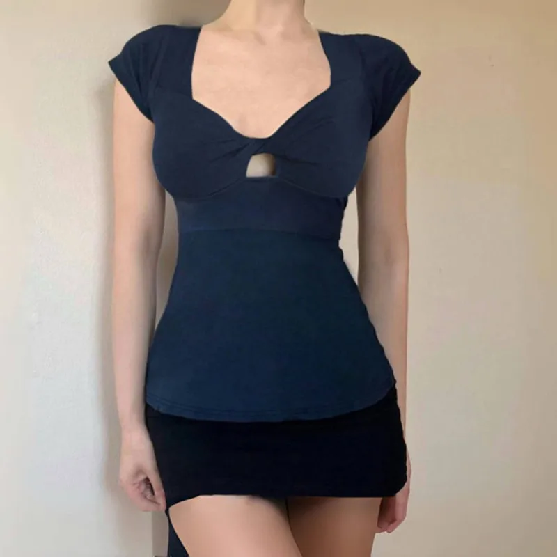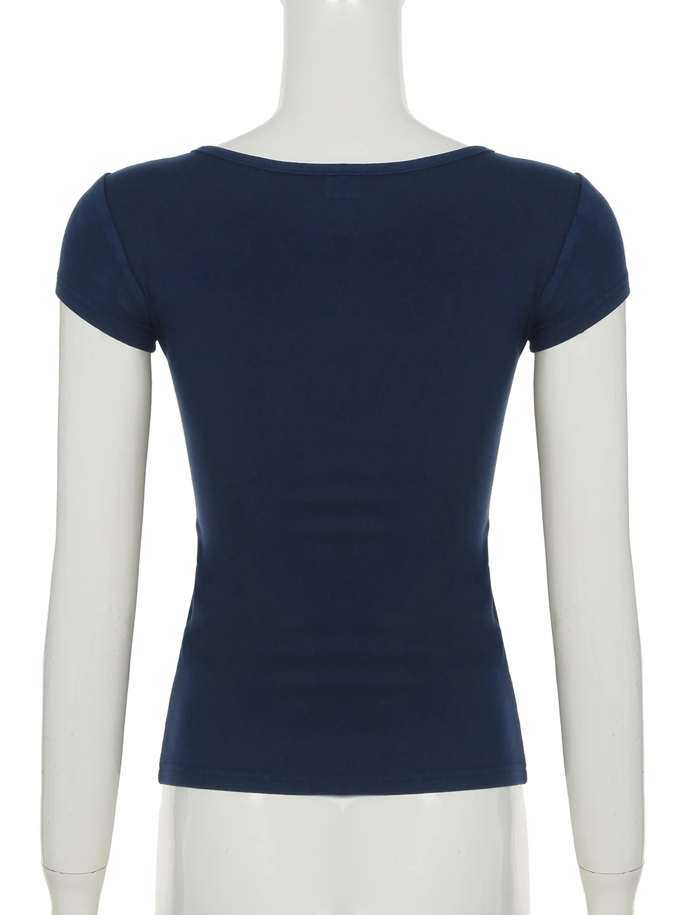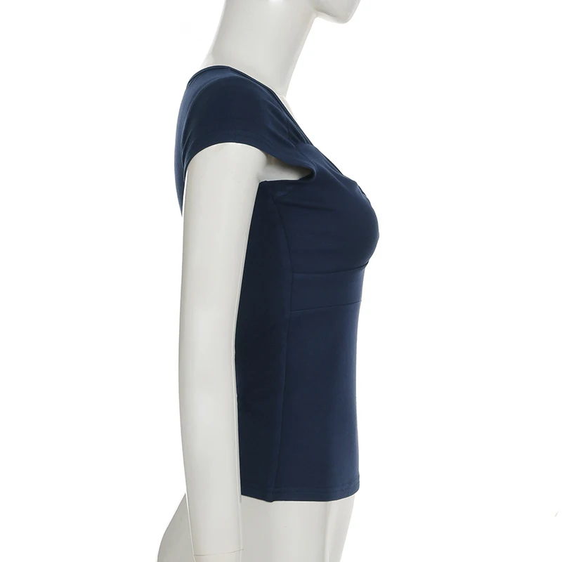 fashionTwist Square Collar Solid T-shirt Basic Vintage Hollow Out Streetwear Casual Fashion Tee Elastic Elegant Top