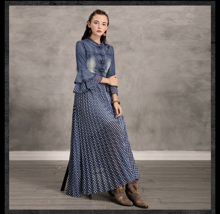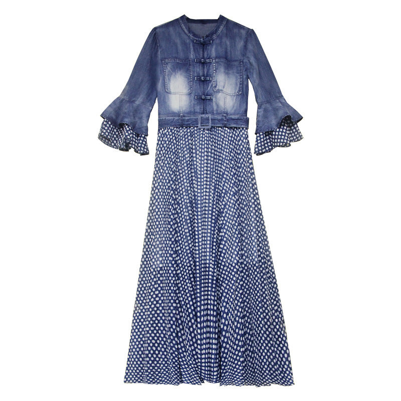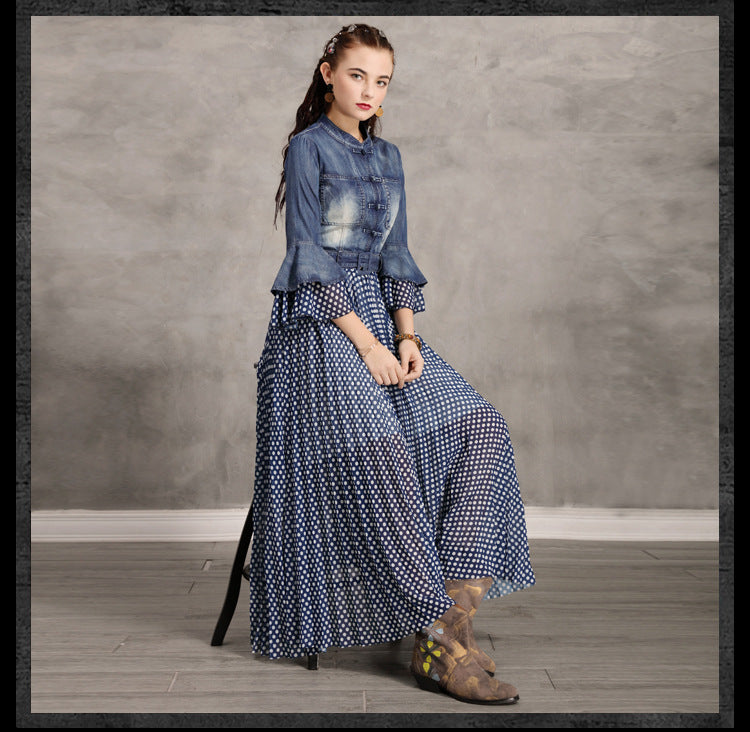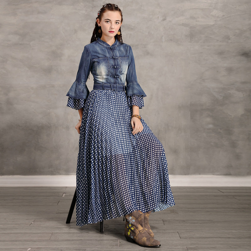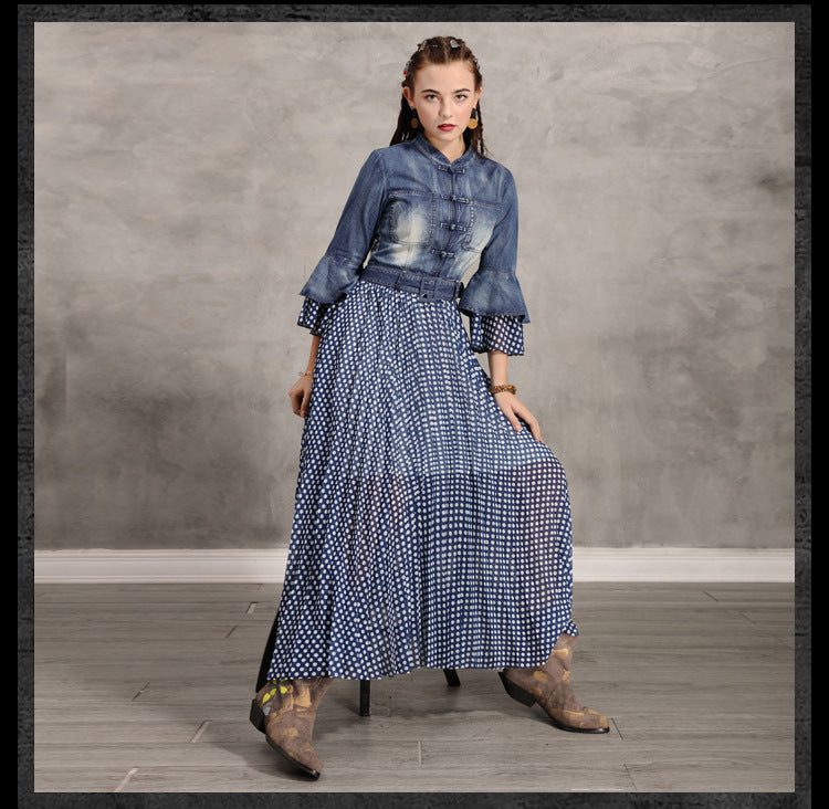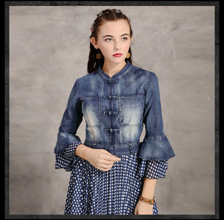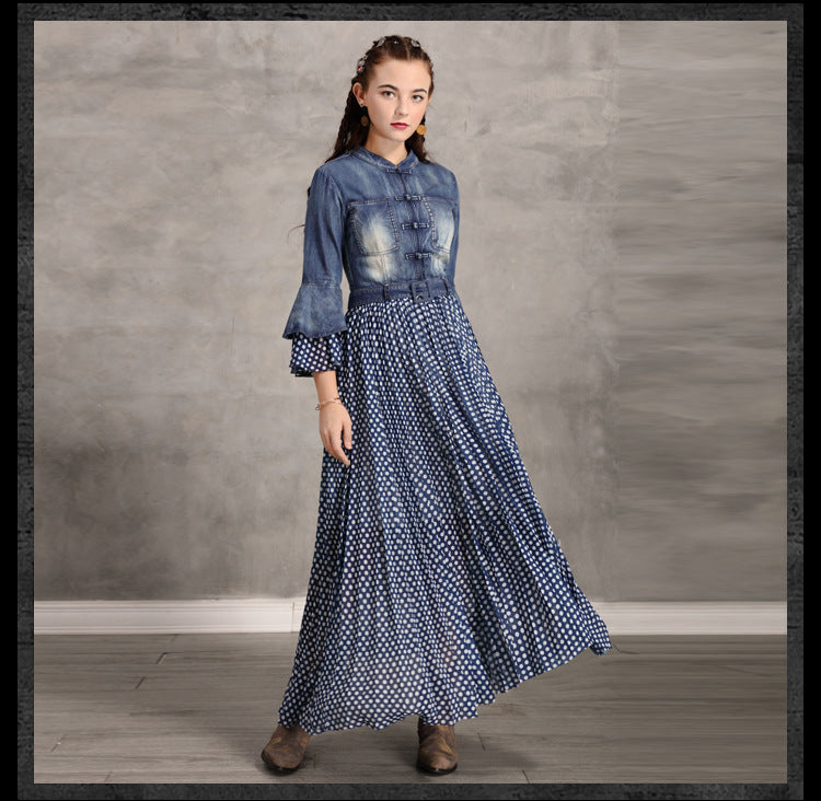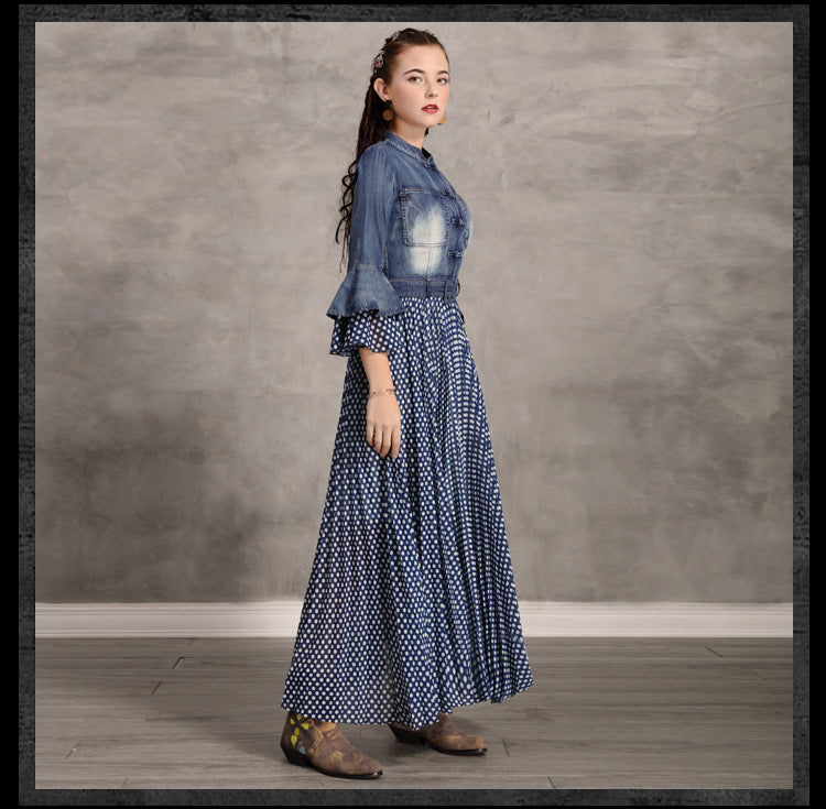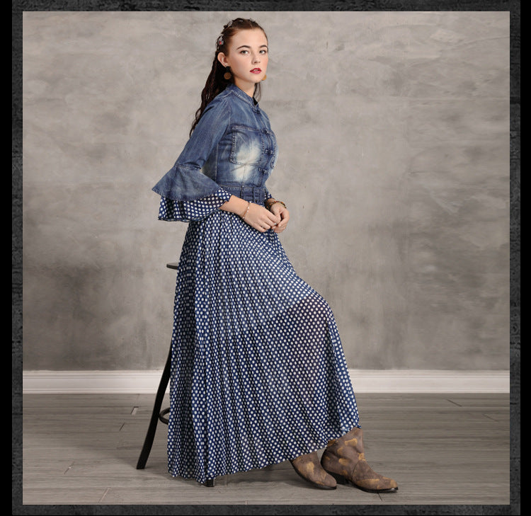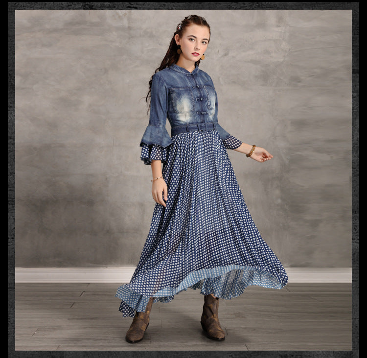 Flare Sleeve Single Breasted Denim Maxi Dresses