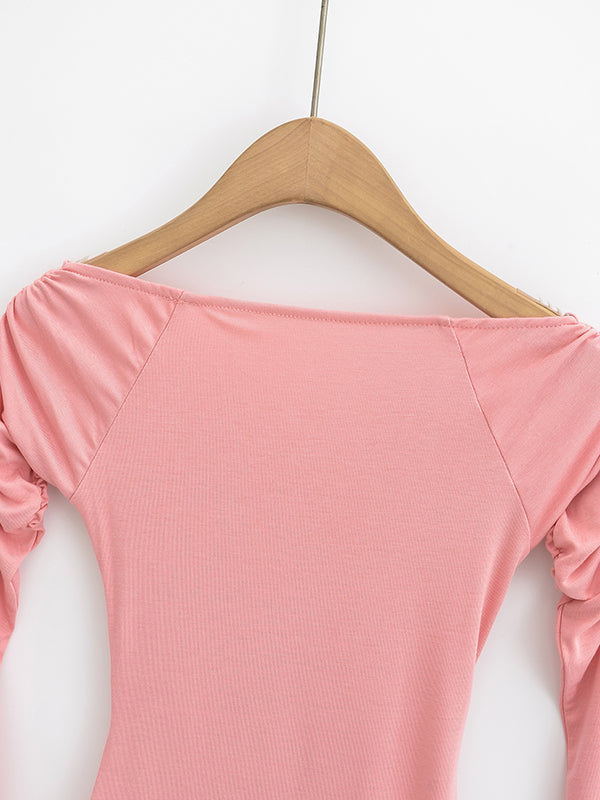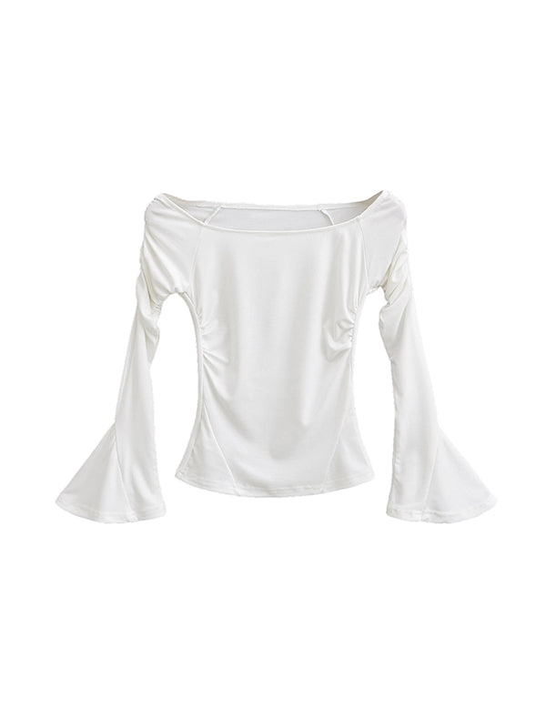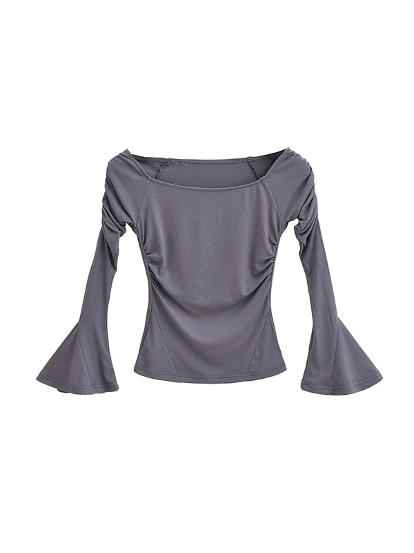 Flared Sleeves Long Sleeves Pleated Solid Color Boat Neck T-Shirts Tops