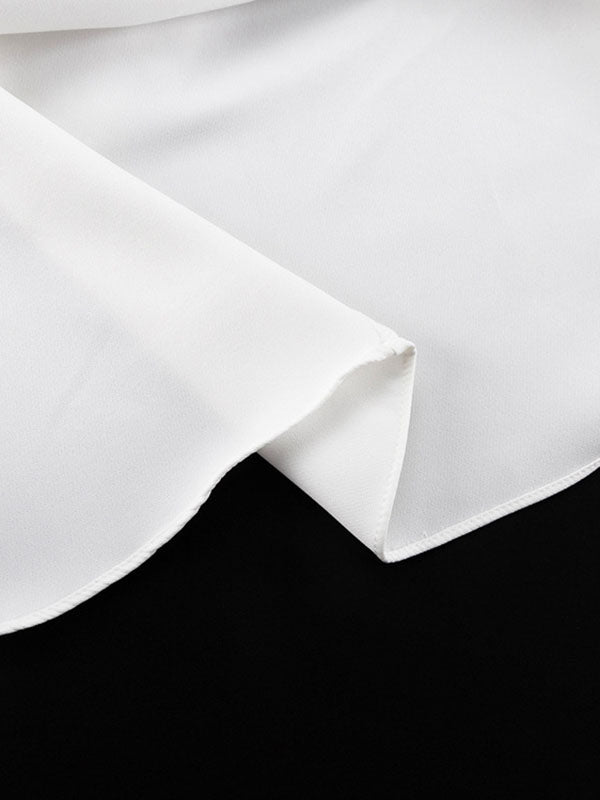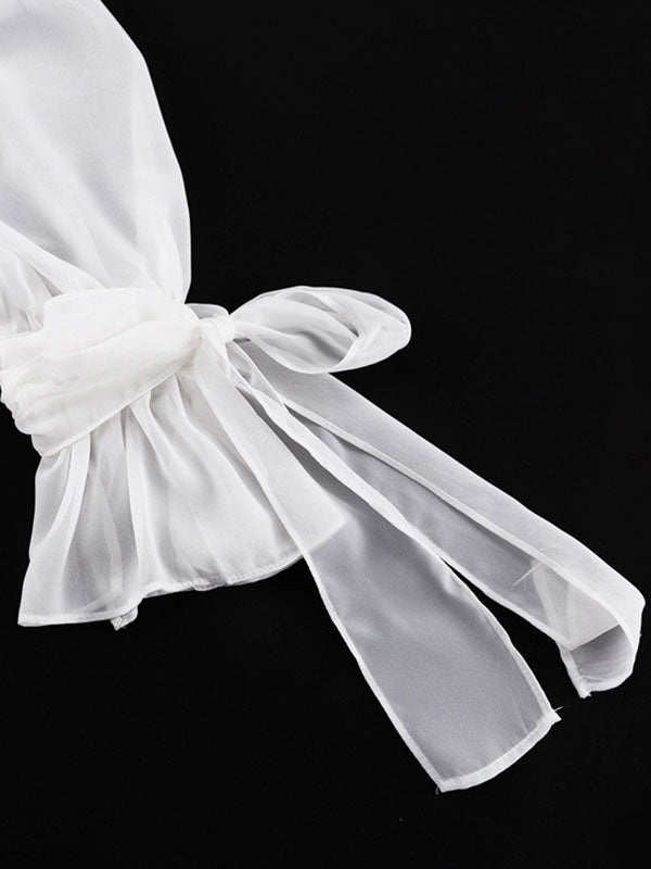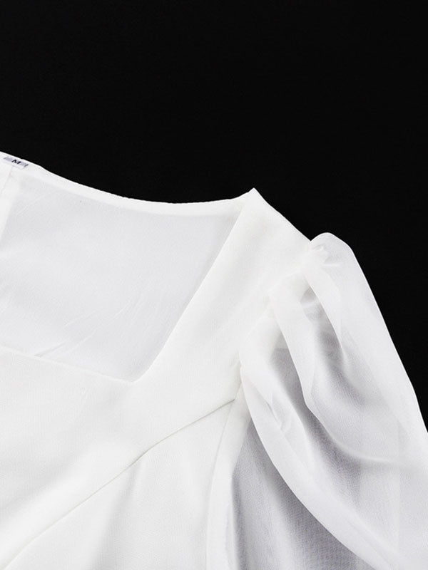 Flared Sleeves Skinny Gauze Pleated See-Through Solid Color Split-Joint Square-Neck Maxi Dresses