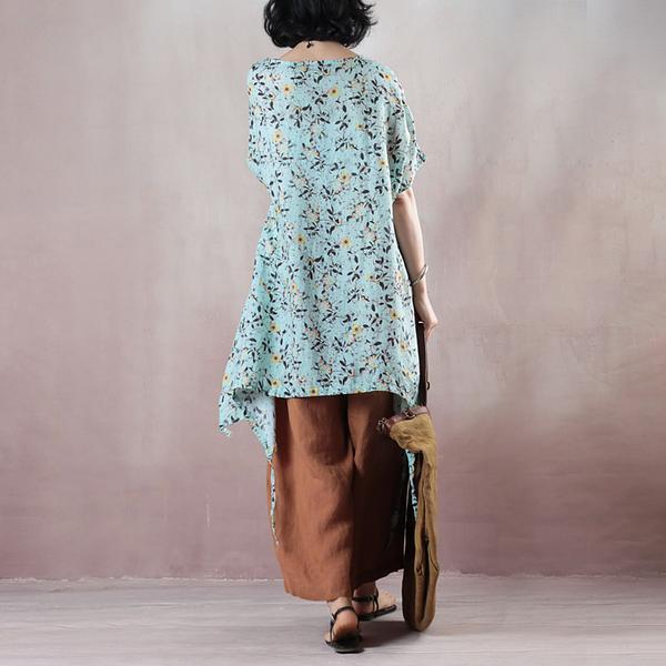 Floral Casual Light Green Round Neck High-Low Hem Shirt