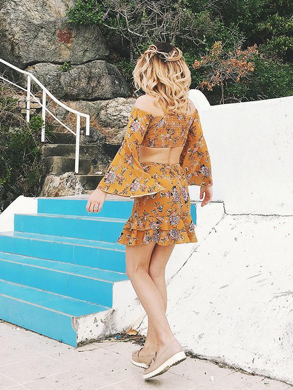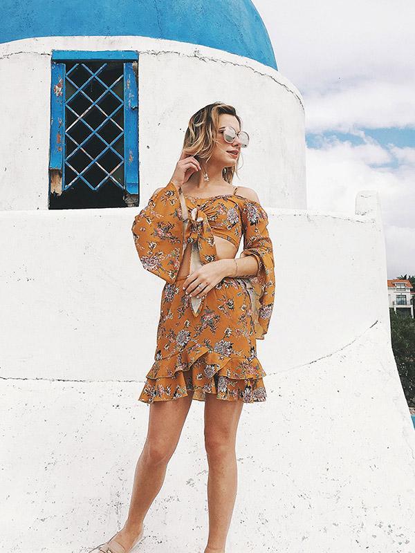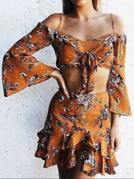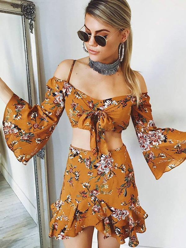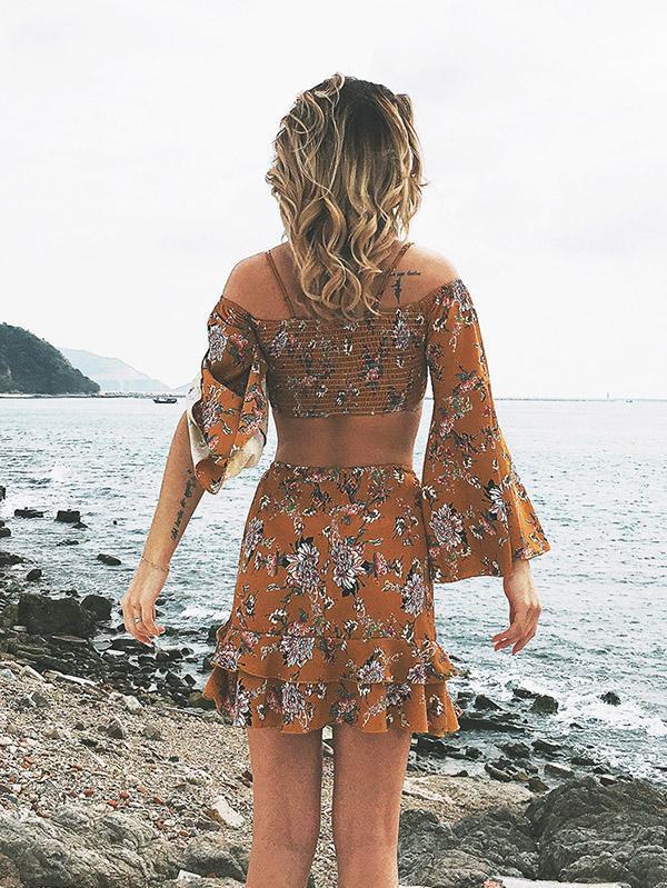 Floral Off Shoulder Flared Sleeves Tops And Skirt Bottoms