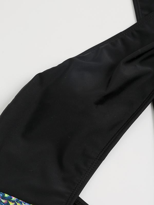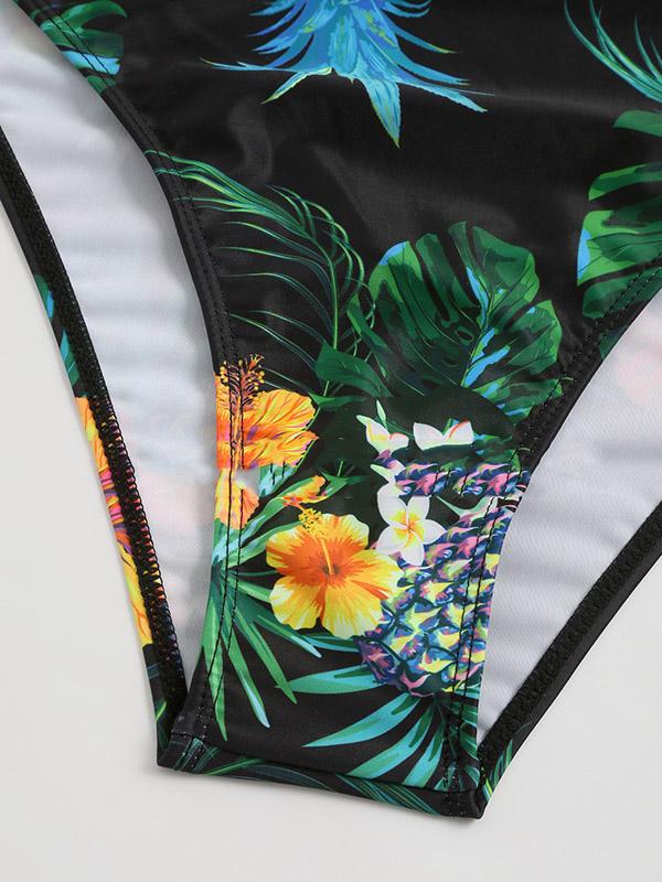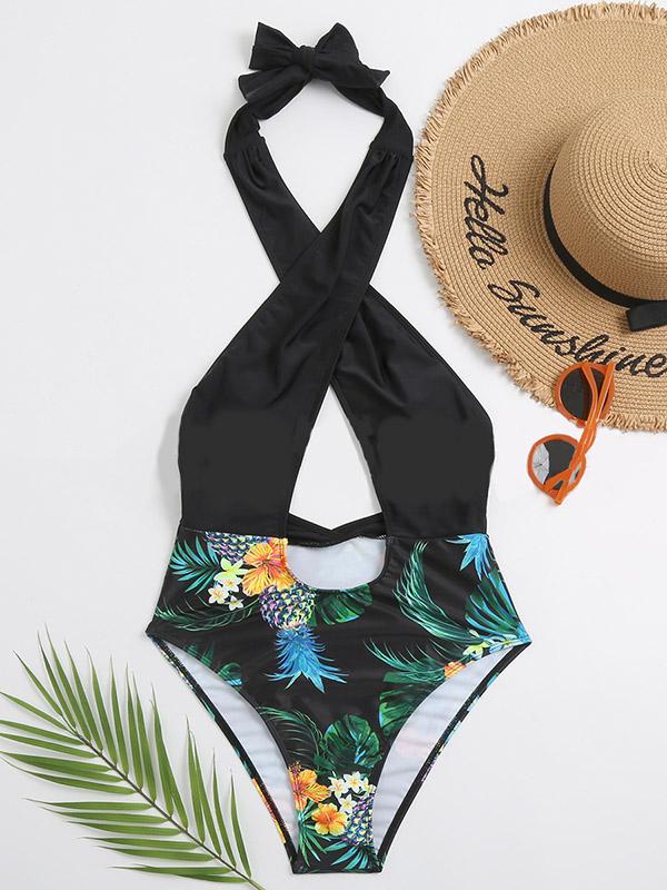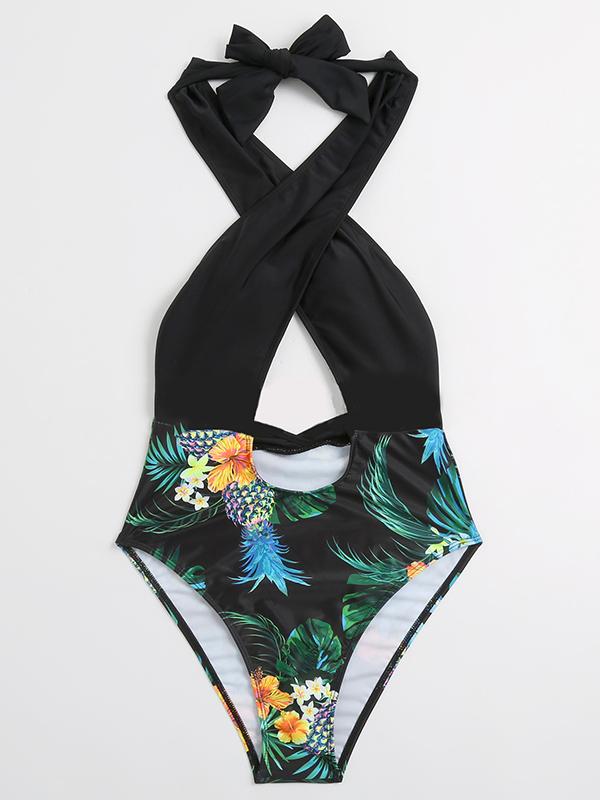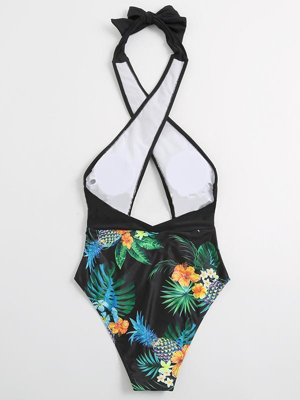 Floral-Print Split-Joint Backless Halterneck One-Piece Swimwear