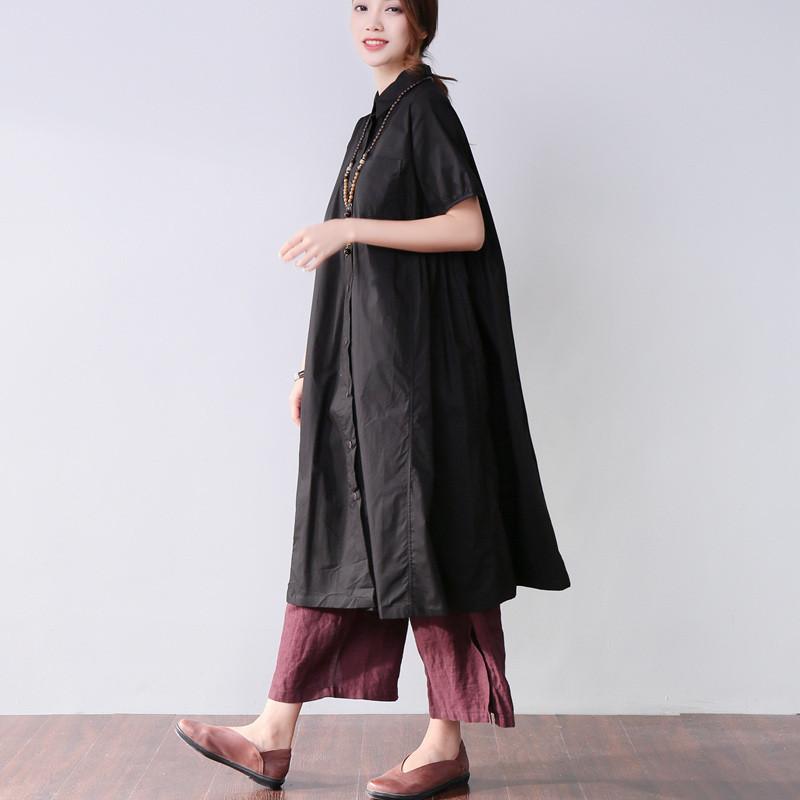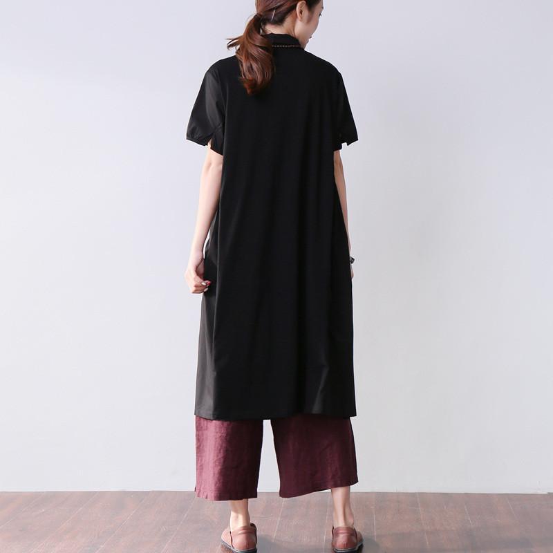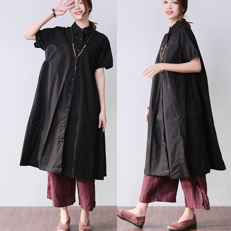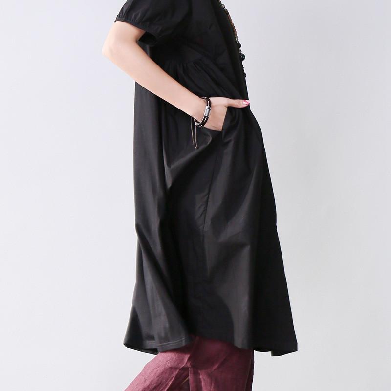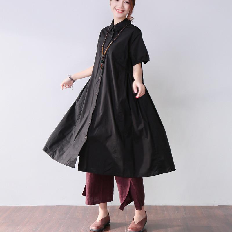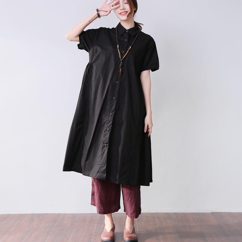 Folded Women Splicing Summer Loose Cotton Black Shirt Dress