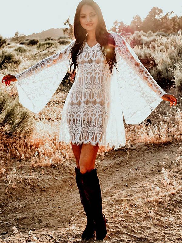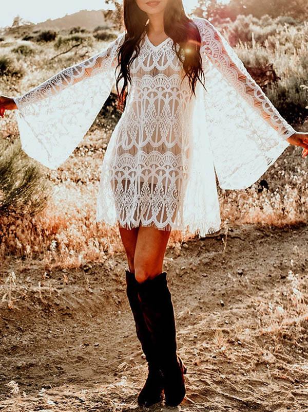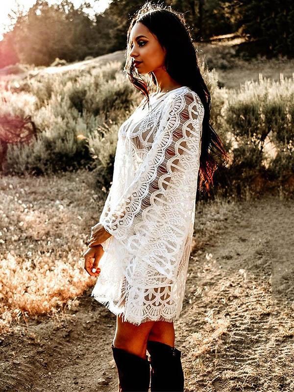 Full Lace Embroidered Flared Sleeve Hollow Vacation Beach Cover-Ups