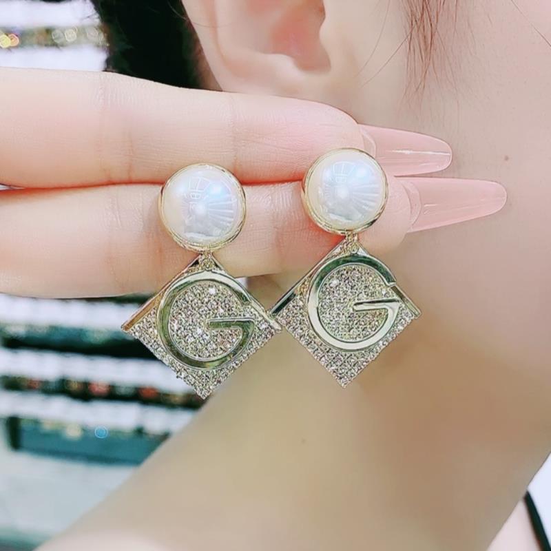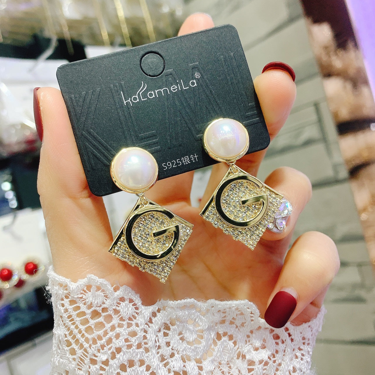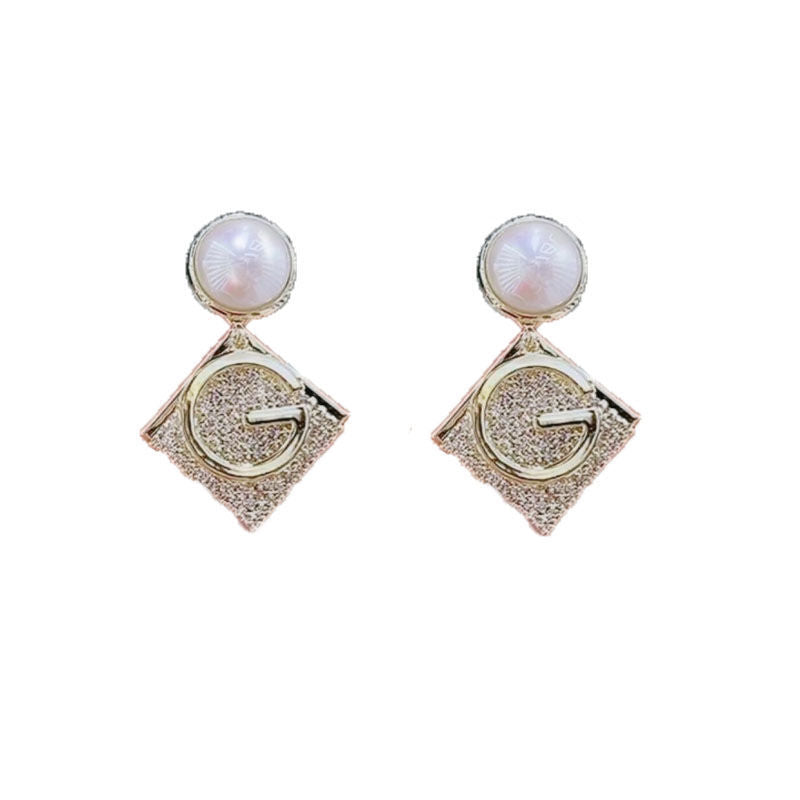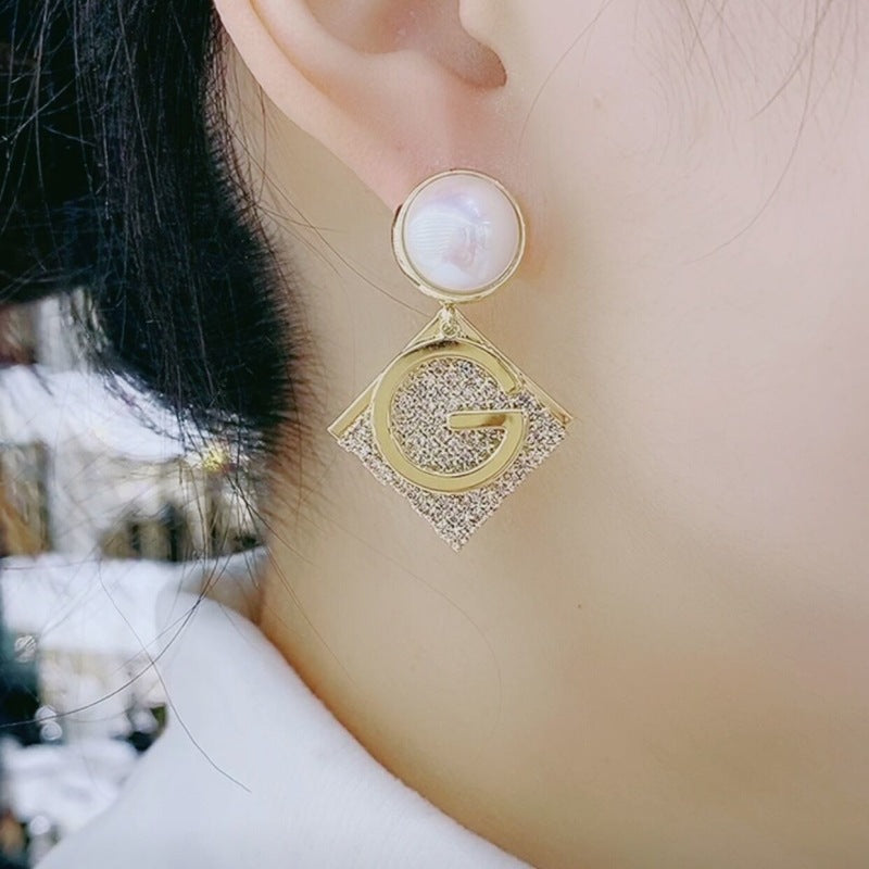 Geometric diamond-shaped pearl S925 silver pin letter earrings