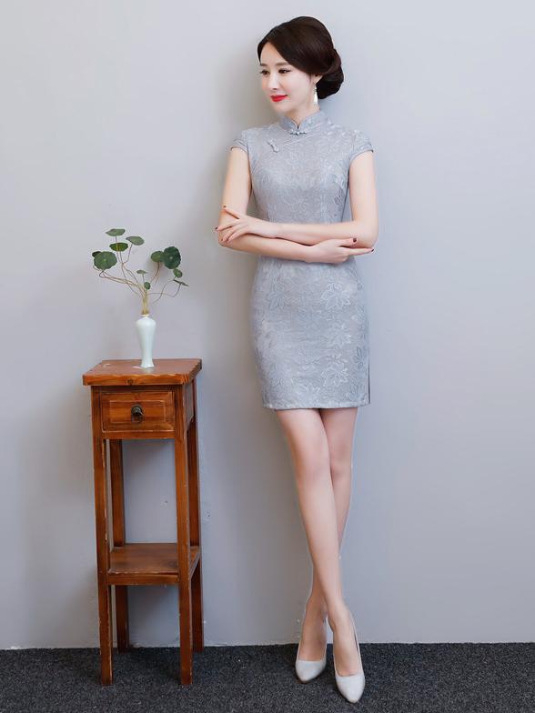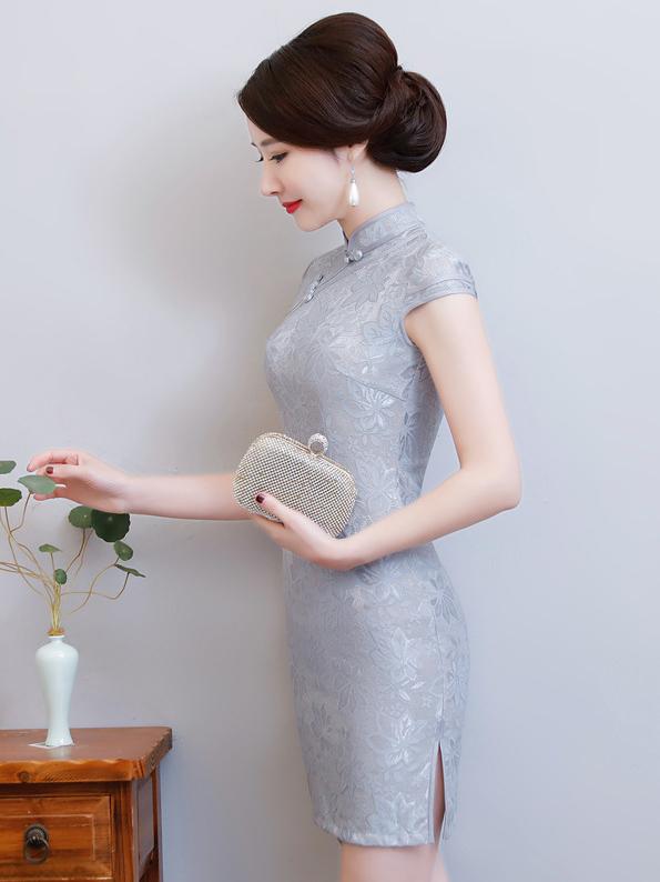 Gray Lace Split-side Short Cheongsam