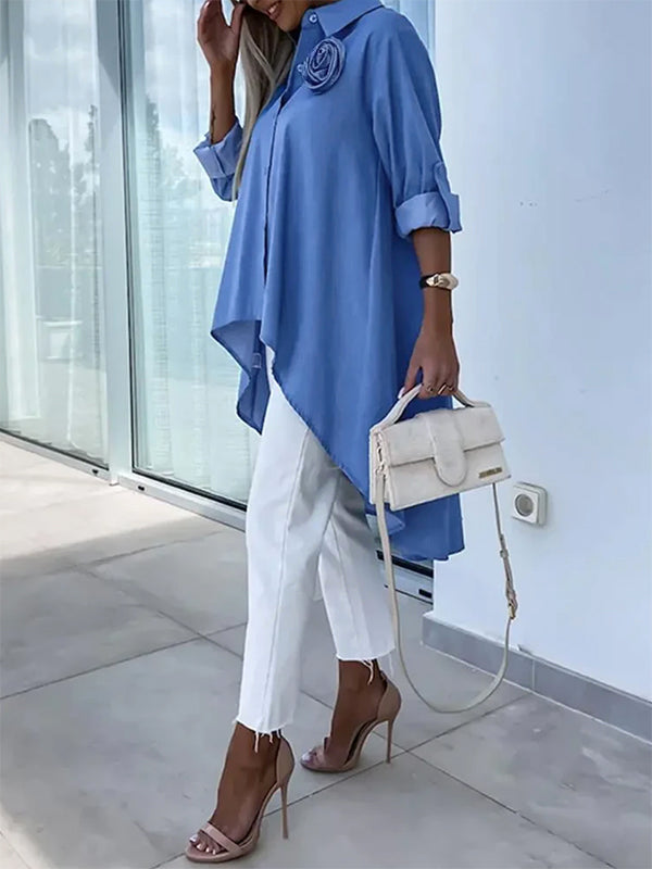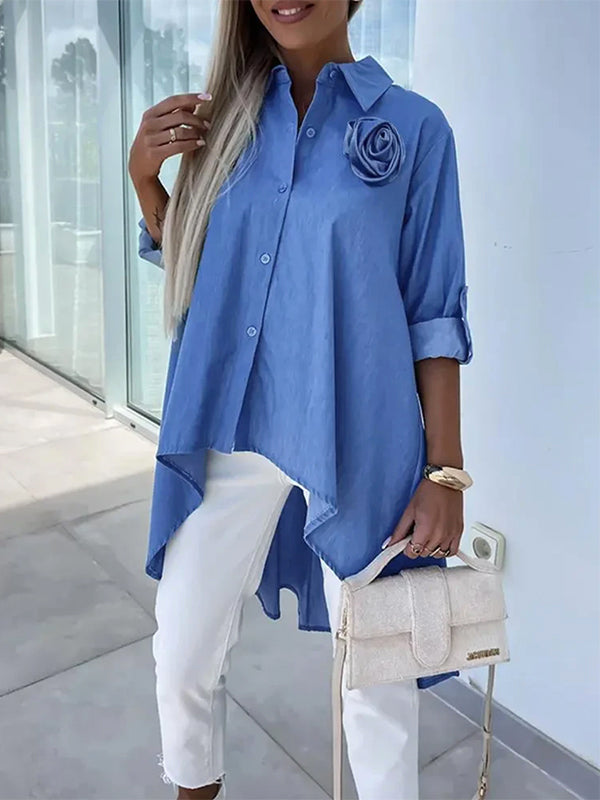 Half Sleeves High-Low Buttoned Pockets Solid Color Lapel Blouses&Shirts Tops