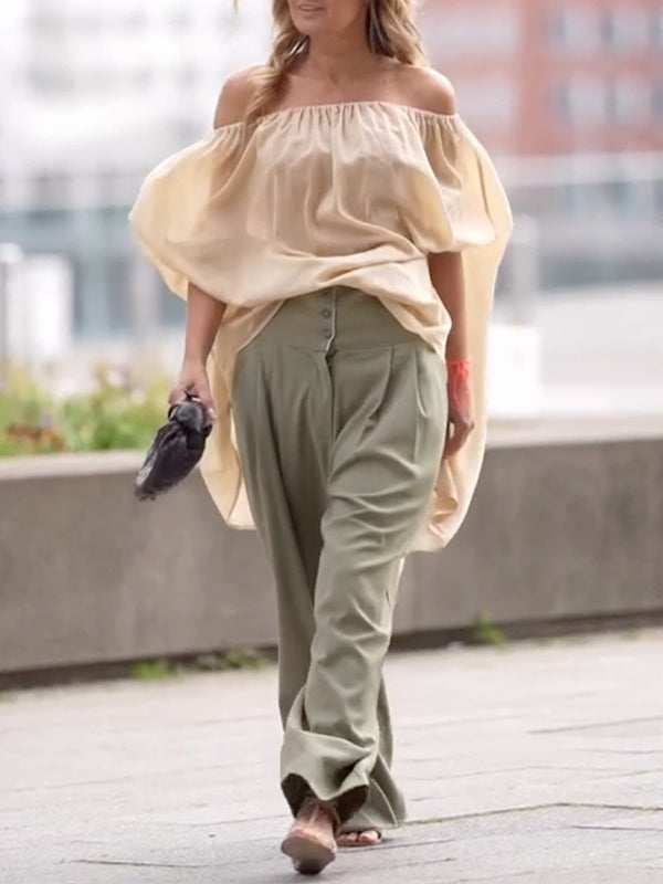 Half Sleeves Loose See-Through Solid Color Off-The-Shoulder Blouses&Shirts Tops