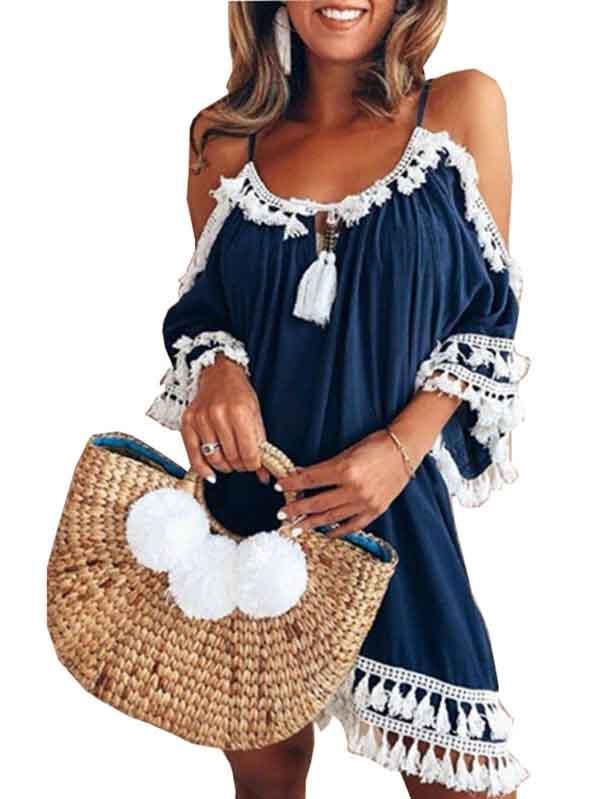 Halterneck Tassels Short Sleeves Mini Dress