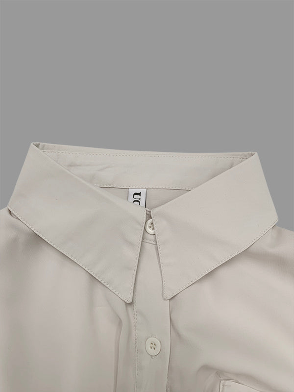 High-Low Long Sleeves Buttoned Drawstring Pleated Pockets Solid Color Lapel Midi Dresses