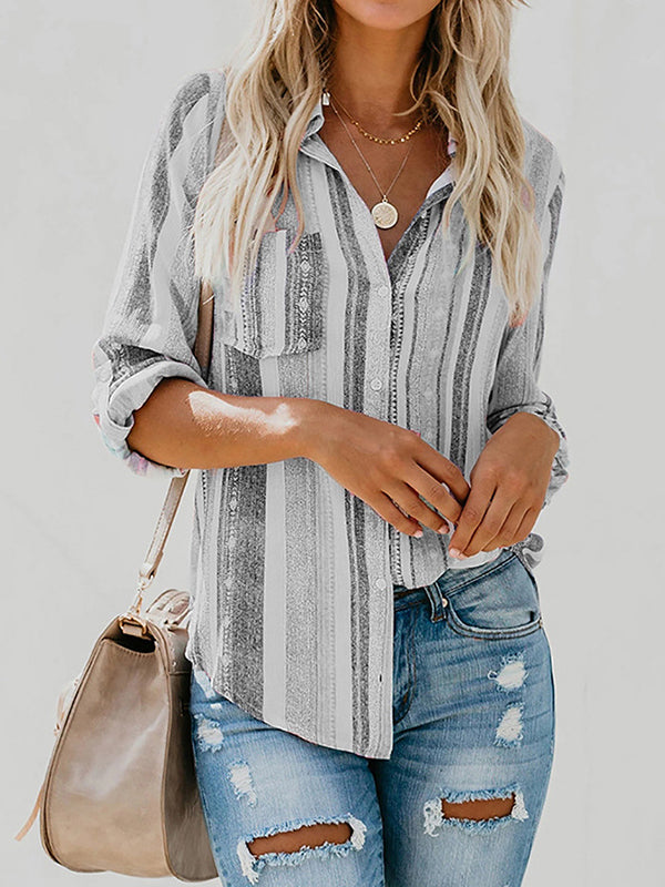 High-Low Long Sleeves Buttoned Pockets Striped Lapel Blouses&Shirts Tops