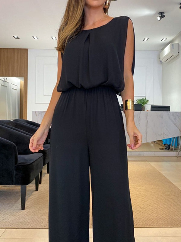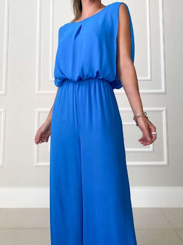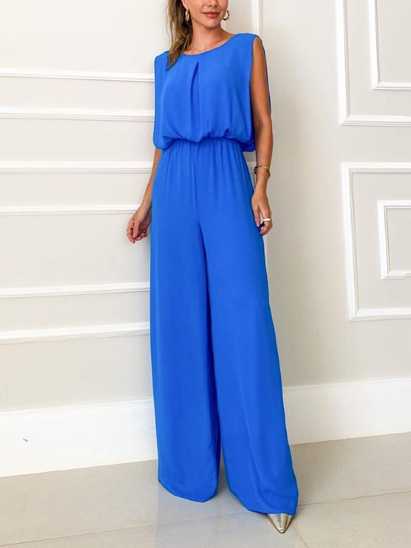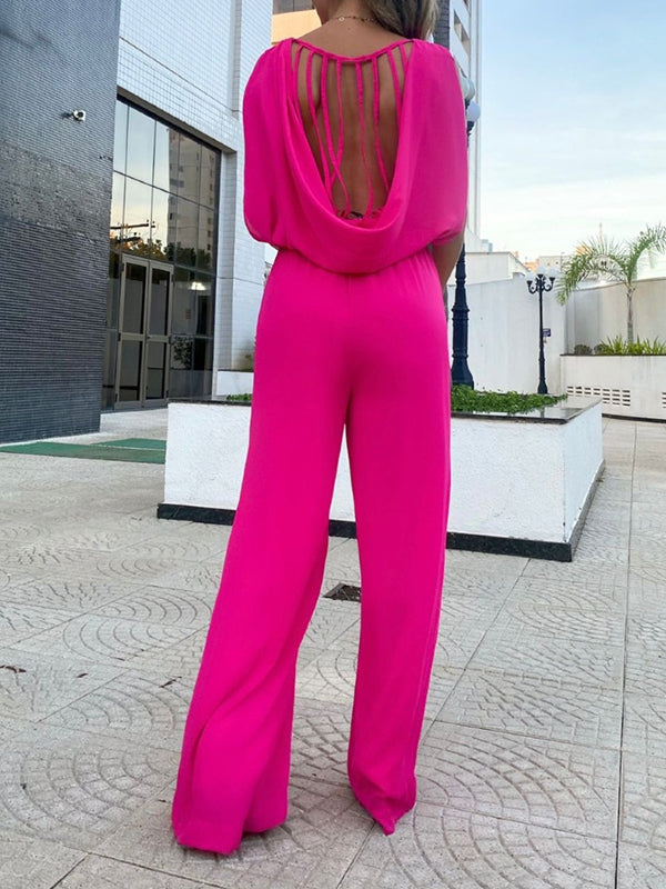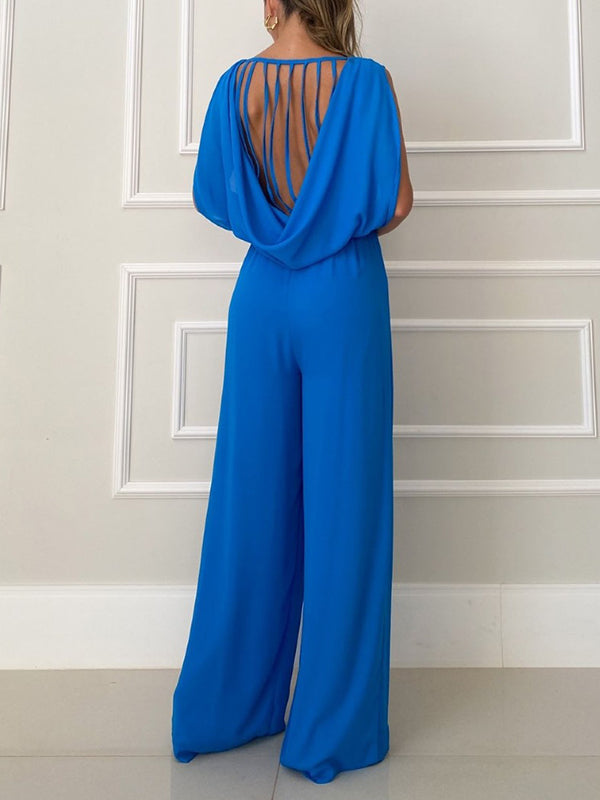 High-Low Wide Leg Backless Hollow Solid Color Round-Neck Jumpsuits Bottoms