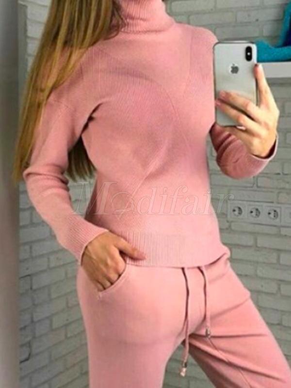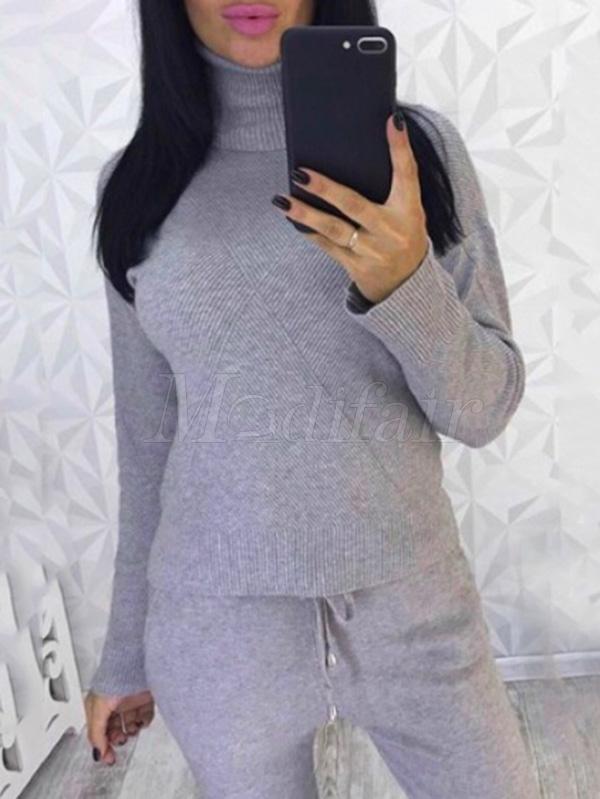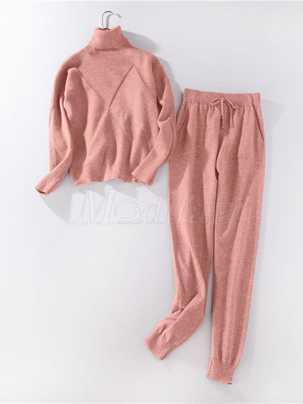 High-neck Rhombic Knitting Sweater and Pants Suits