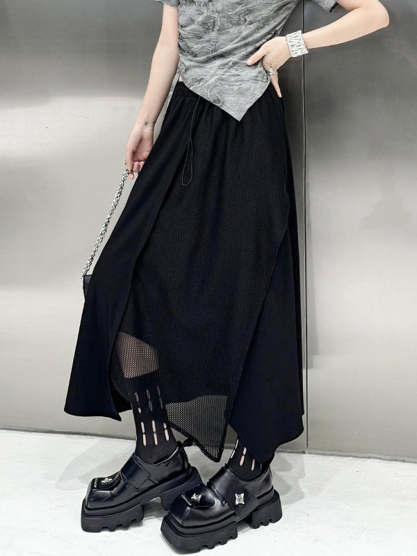 High Waisted Irregularity Asymmetric Drawstring Elasticity See-Through Solid Color Split-Joint Skirts