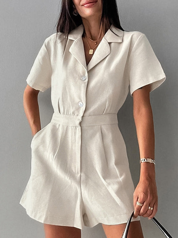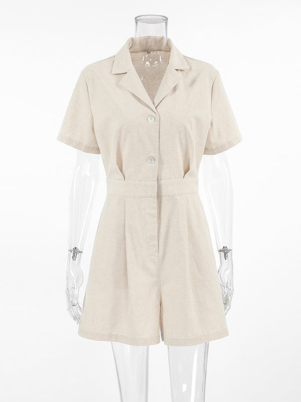 High Waisted Loose Buttoned Pleated Pockets Solid Color Split-Joint Notched Collar Rompers