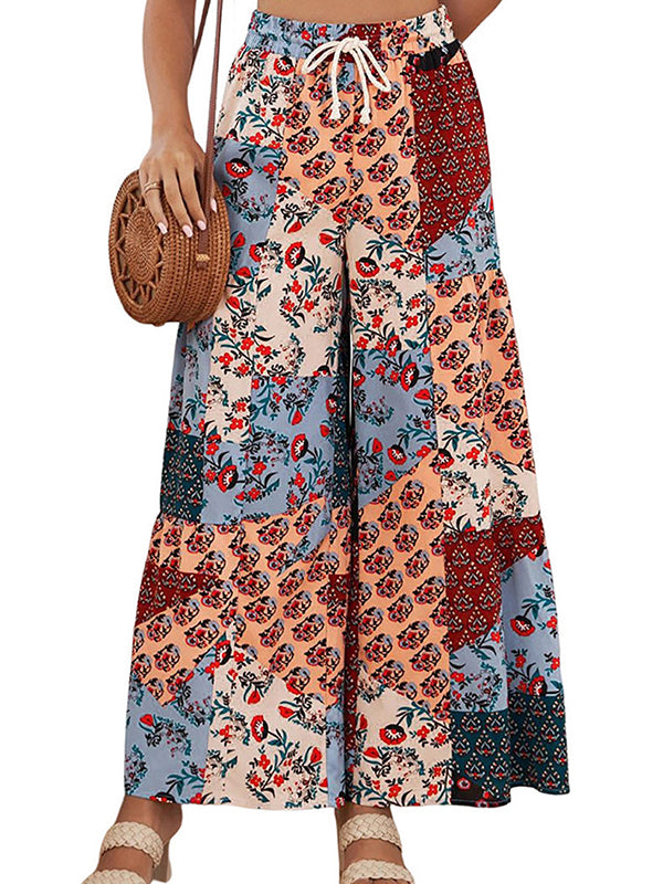 High Waisted Loose Drawstring Flower Print Pleated Pants Trousers