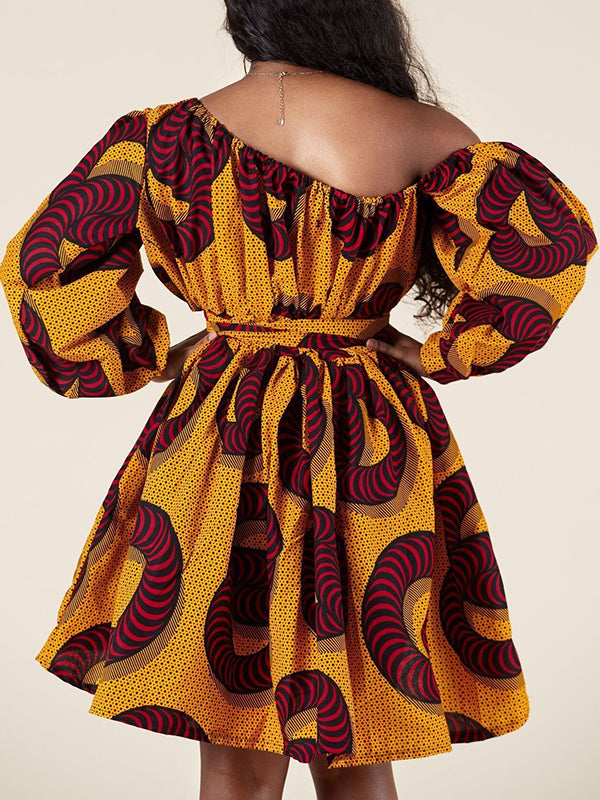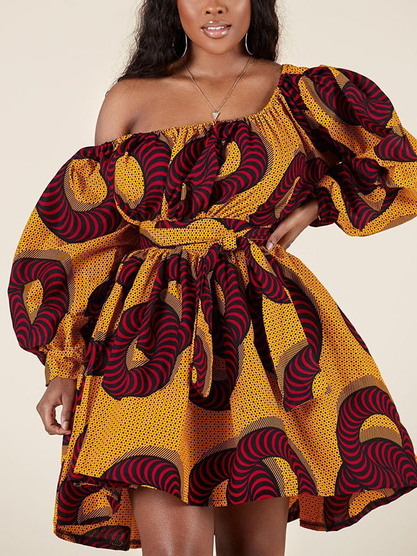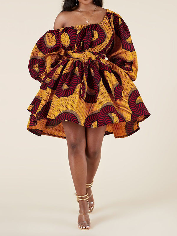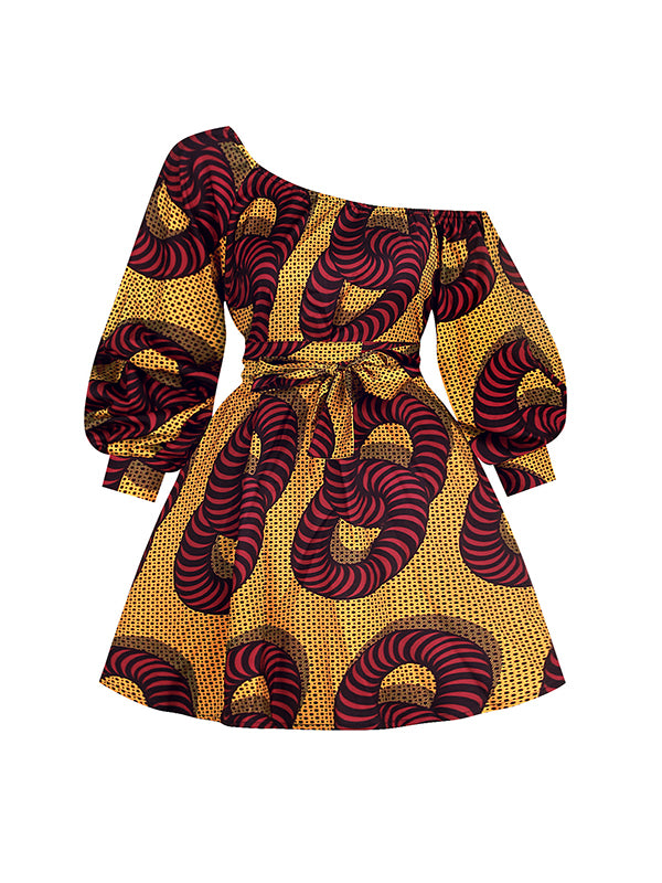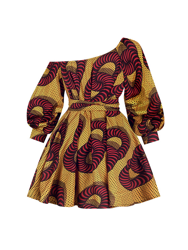 High Waisted Loose Elasticity Polka-Dot Printed Tied Waist One-Shoulder Mini Dresses