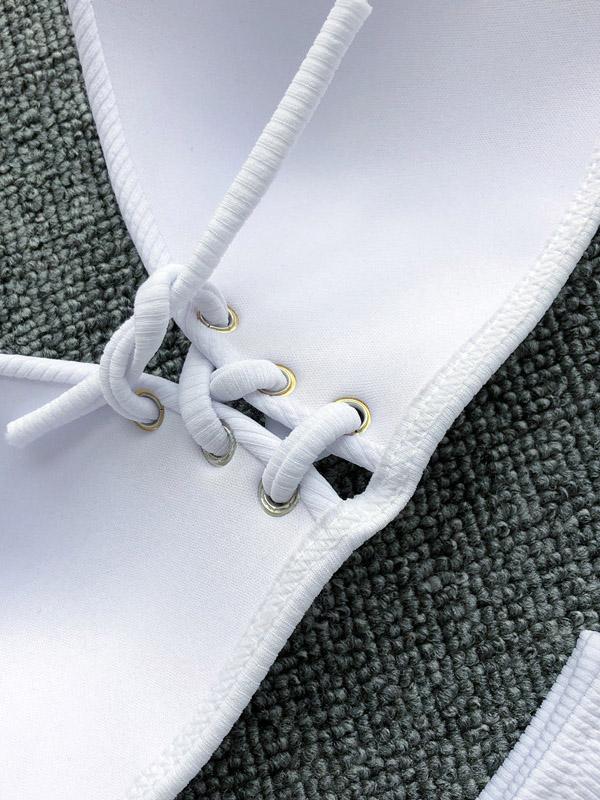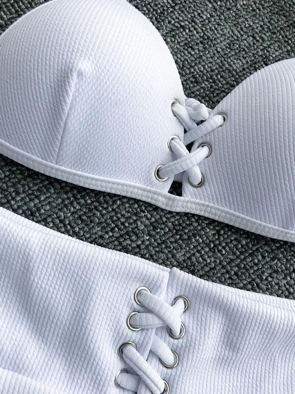 High Waisted Ribbed Lattice Strappy Bikini Swimsuit