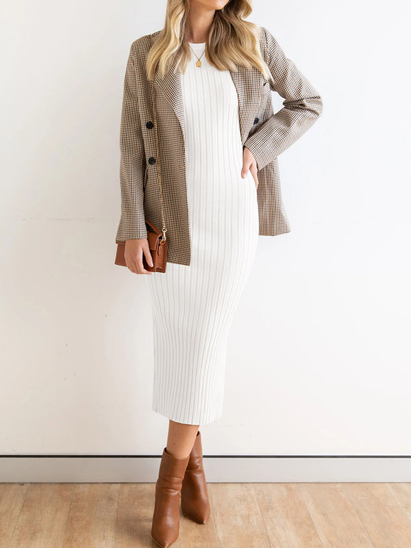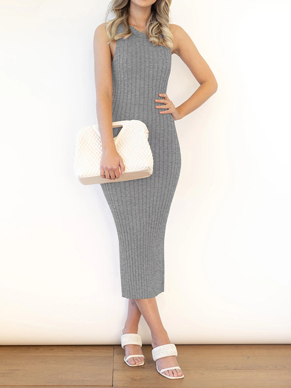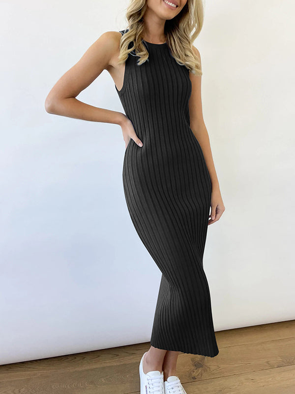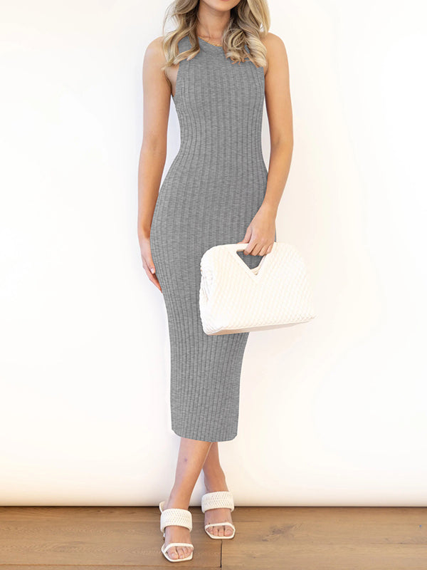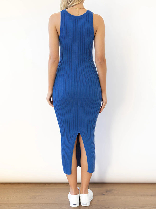 High Waisted Skinny Solid Color Split-Back Round-Neck Midi Dresses