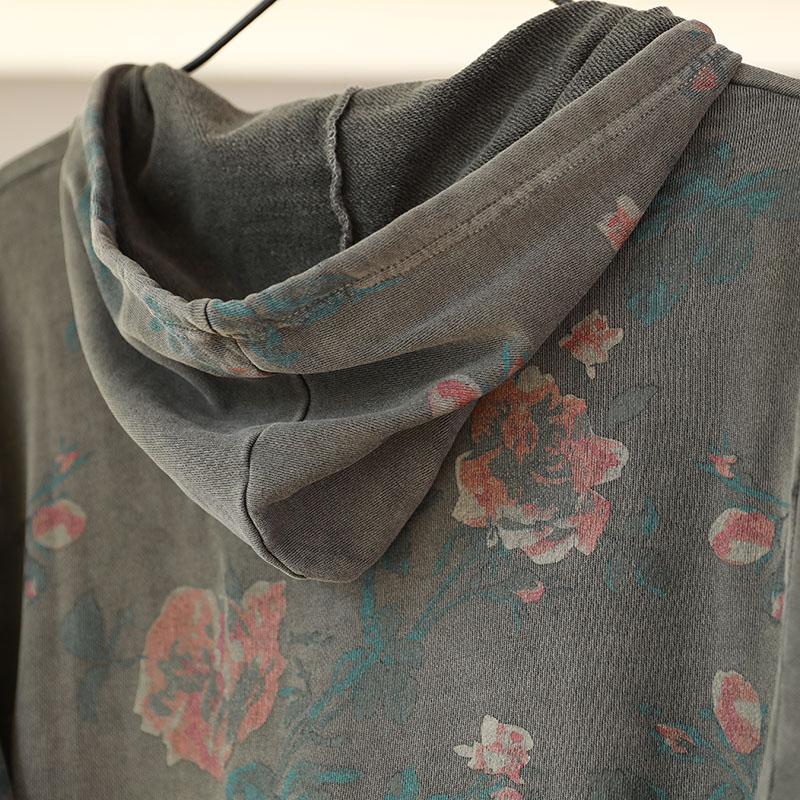 Hoodies Single Breasted Floral Printed Women Gray Coat