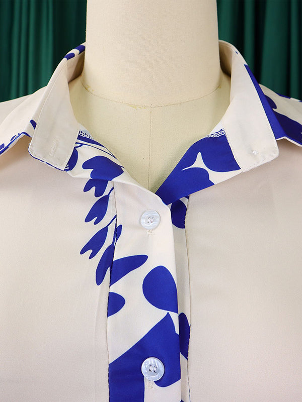 Irregular clipping Long Sleeves Lace-Up Pleated Printed Split-Joint Tied Waist Lapel Maxi Dresses Shirt Dress