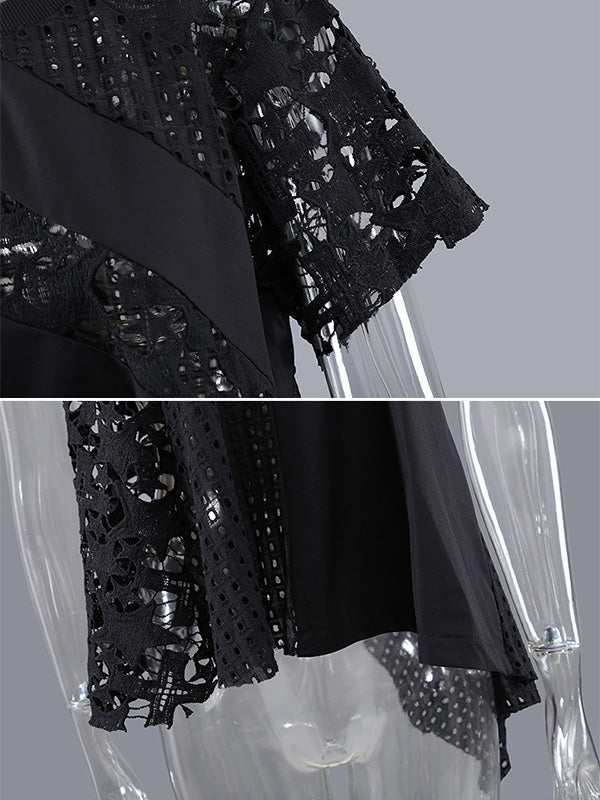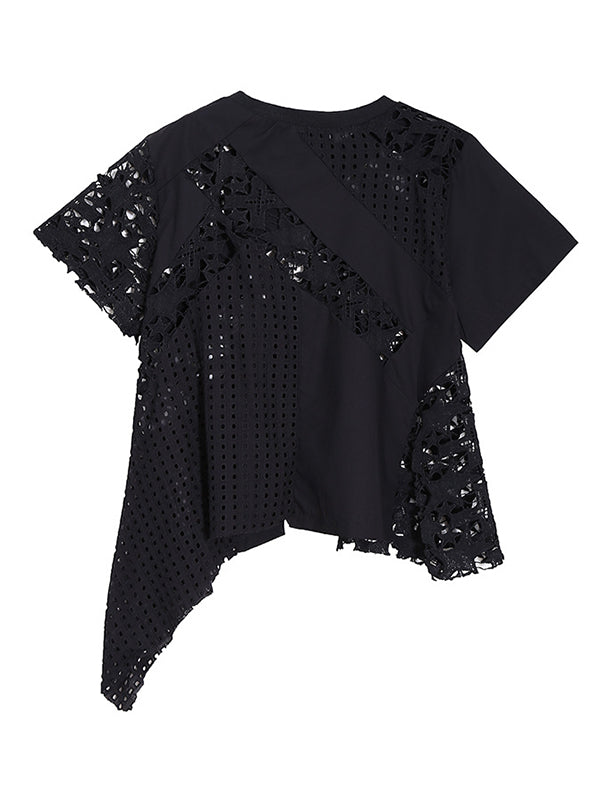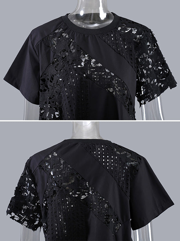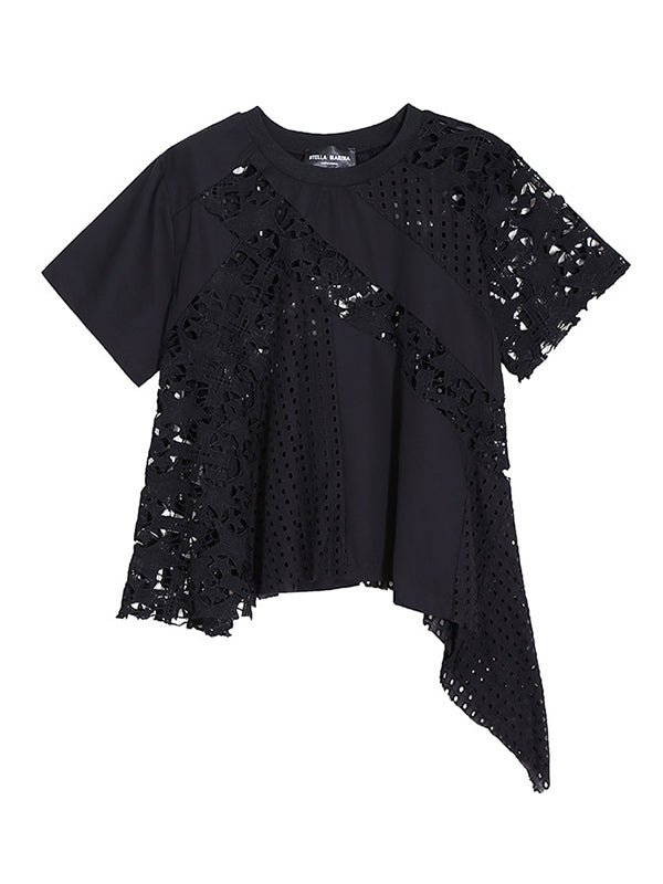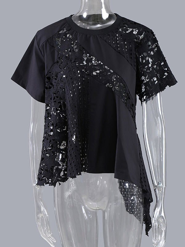 Irregular Hollow Lace Solid Color Round-Neck Short Sleeves T-Shirt Tops