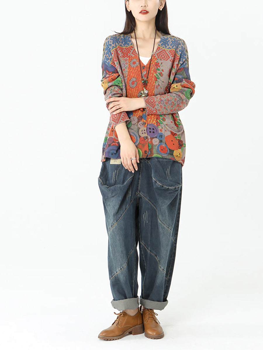 Plus-Size Vintage Pocket Long Sleeve Cardigans Women Sweater