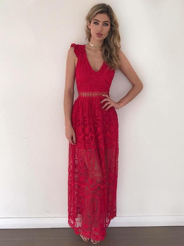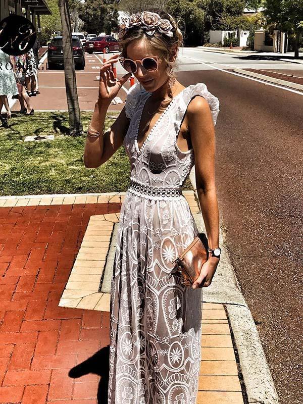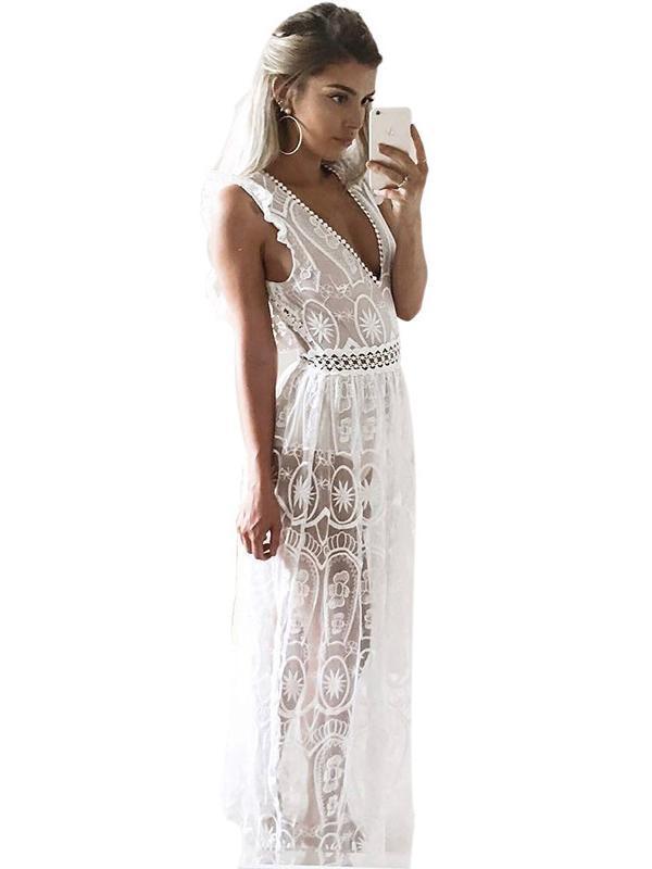 Lace Deep V-neck Backless Hollow Maxi Dress