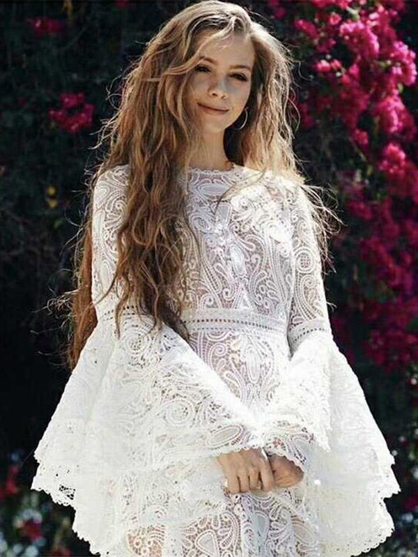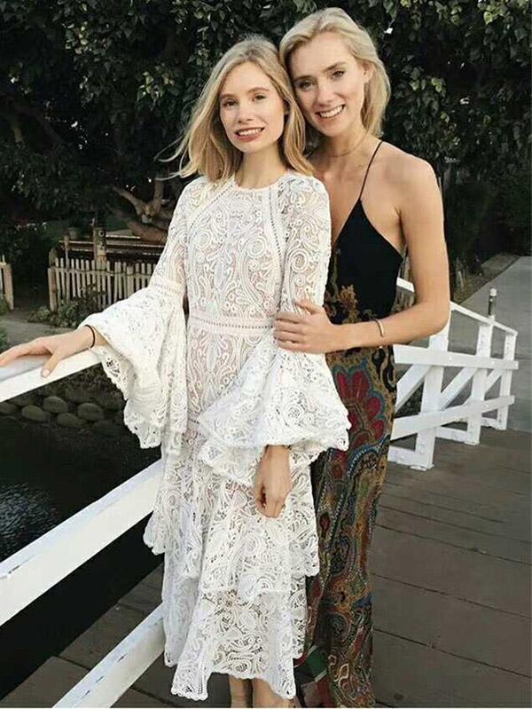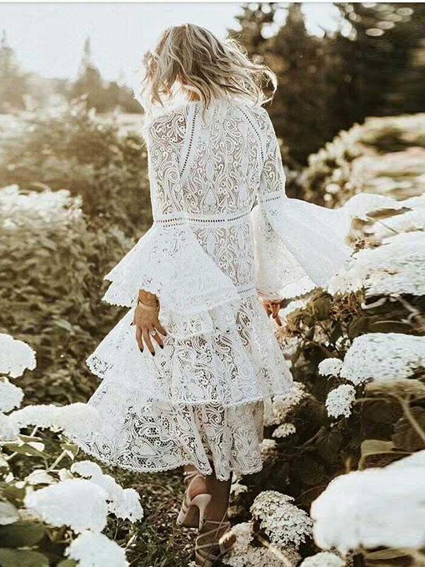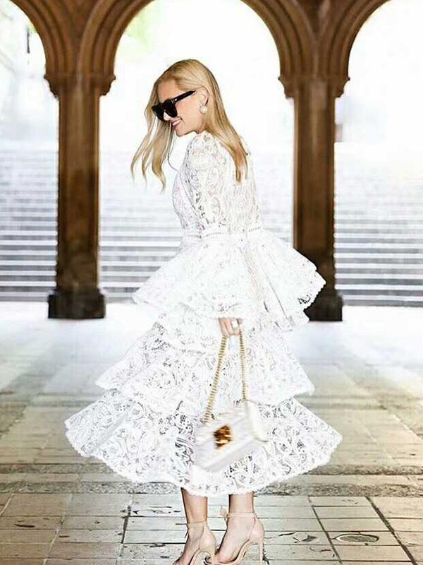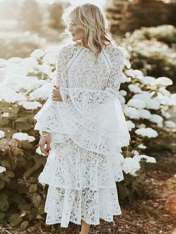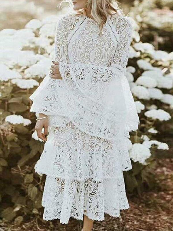 Lace Flared Sleeves Tiered Falbala Midi Dress