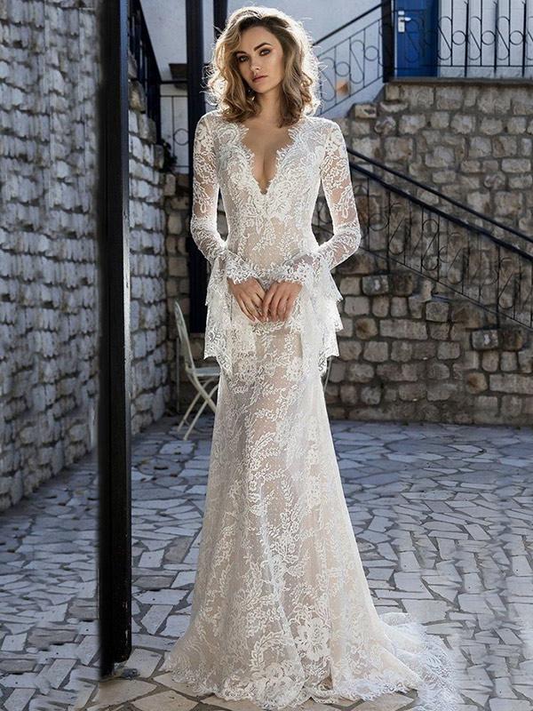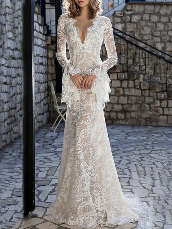 Lace Flared Sleeves V-back Evening Dress