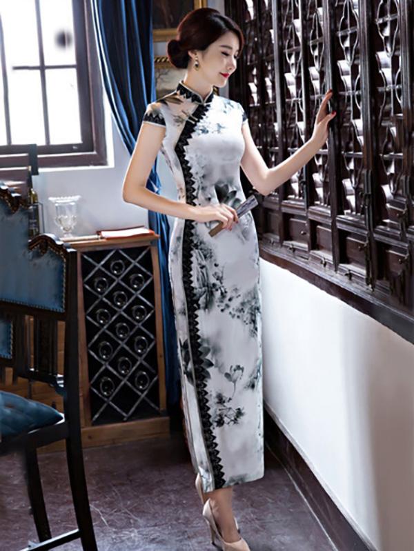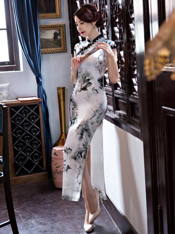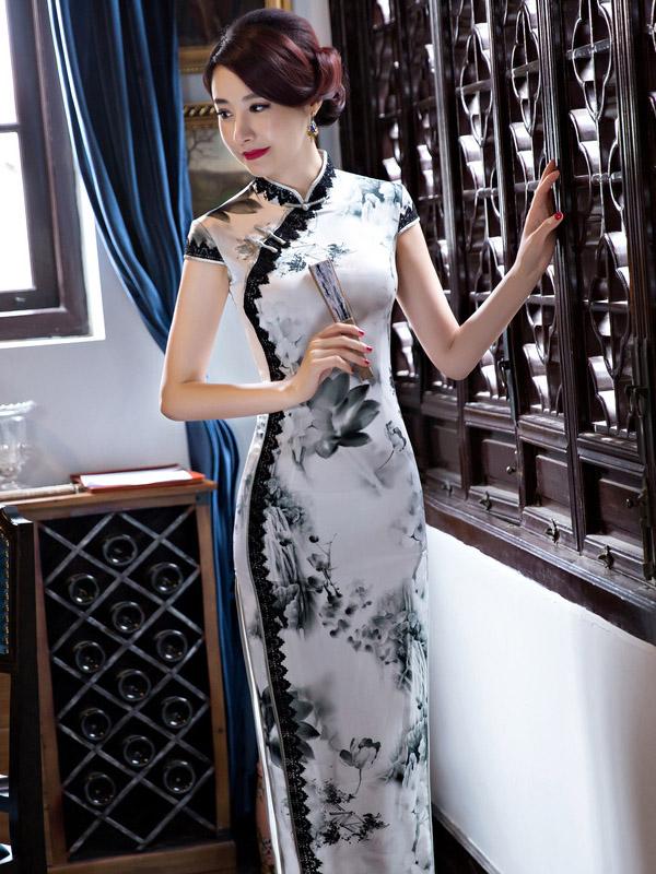 Lacy Ink&Lotus Print Long Cheongsam Dress