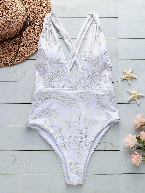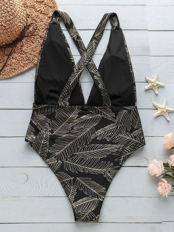 Leaf Pattern Deep V-neck One-piece Swimwear