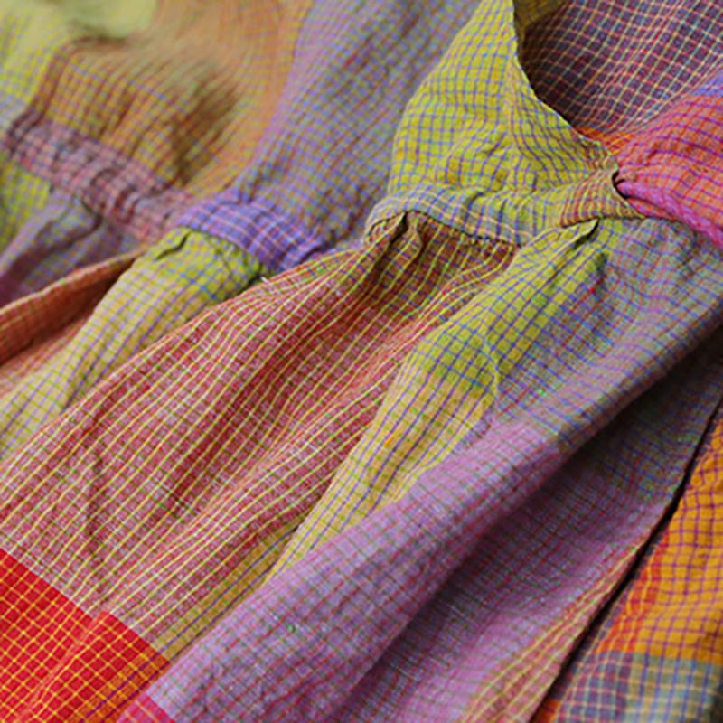 Linen V-Neck Plaid Short Sleeve Drawstring Dress